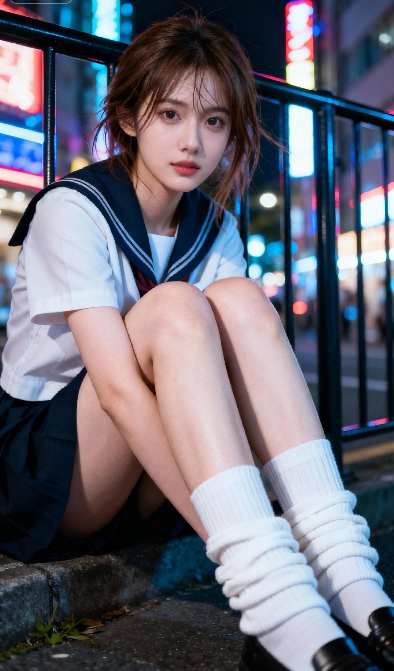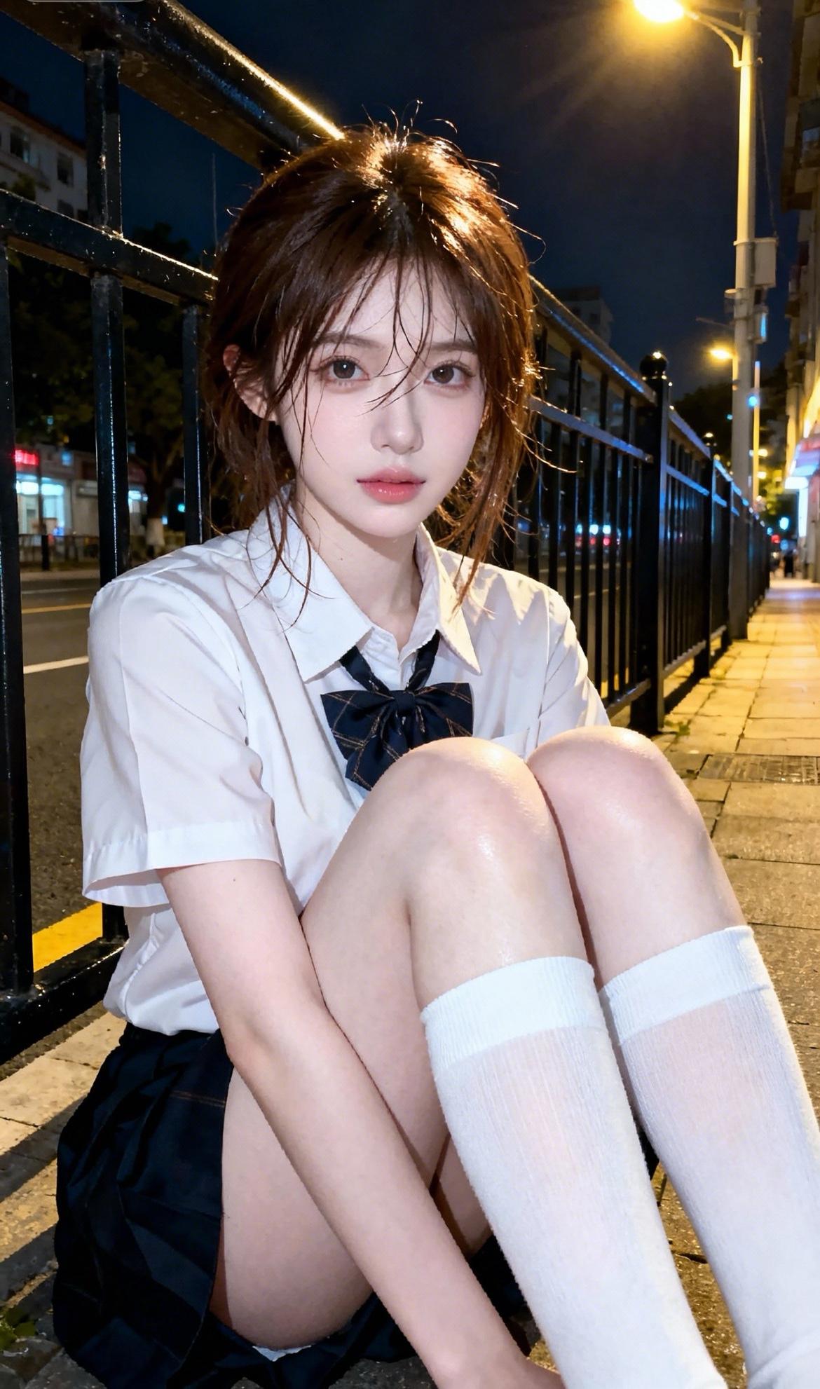 夜晚街头的少女,穿着校服,甜美又神秘。街头时尚美少女 青涩校服少女 街拍清纯少女