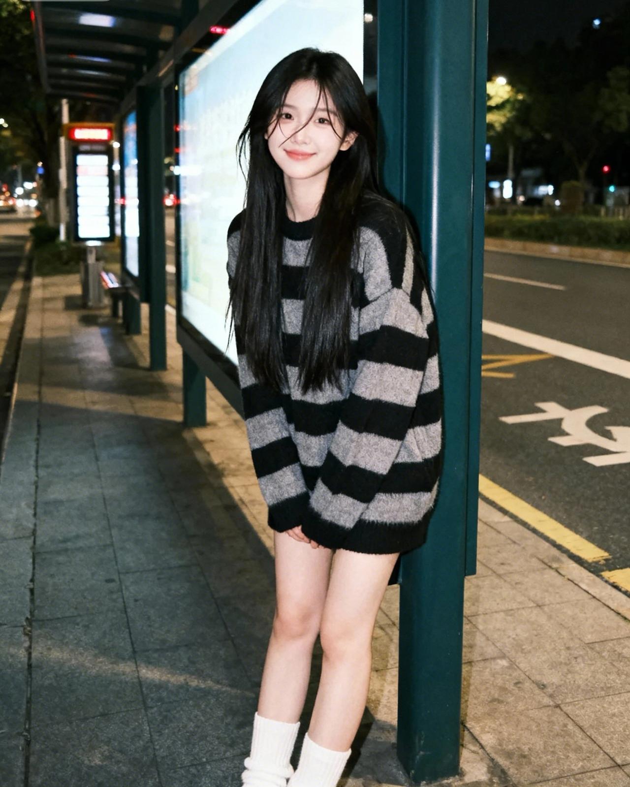 晚上在公交站等车的漂亮女孩。城市街头少女 街角里的美女 下班路上的美女
