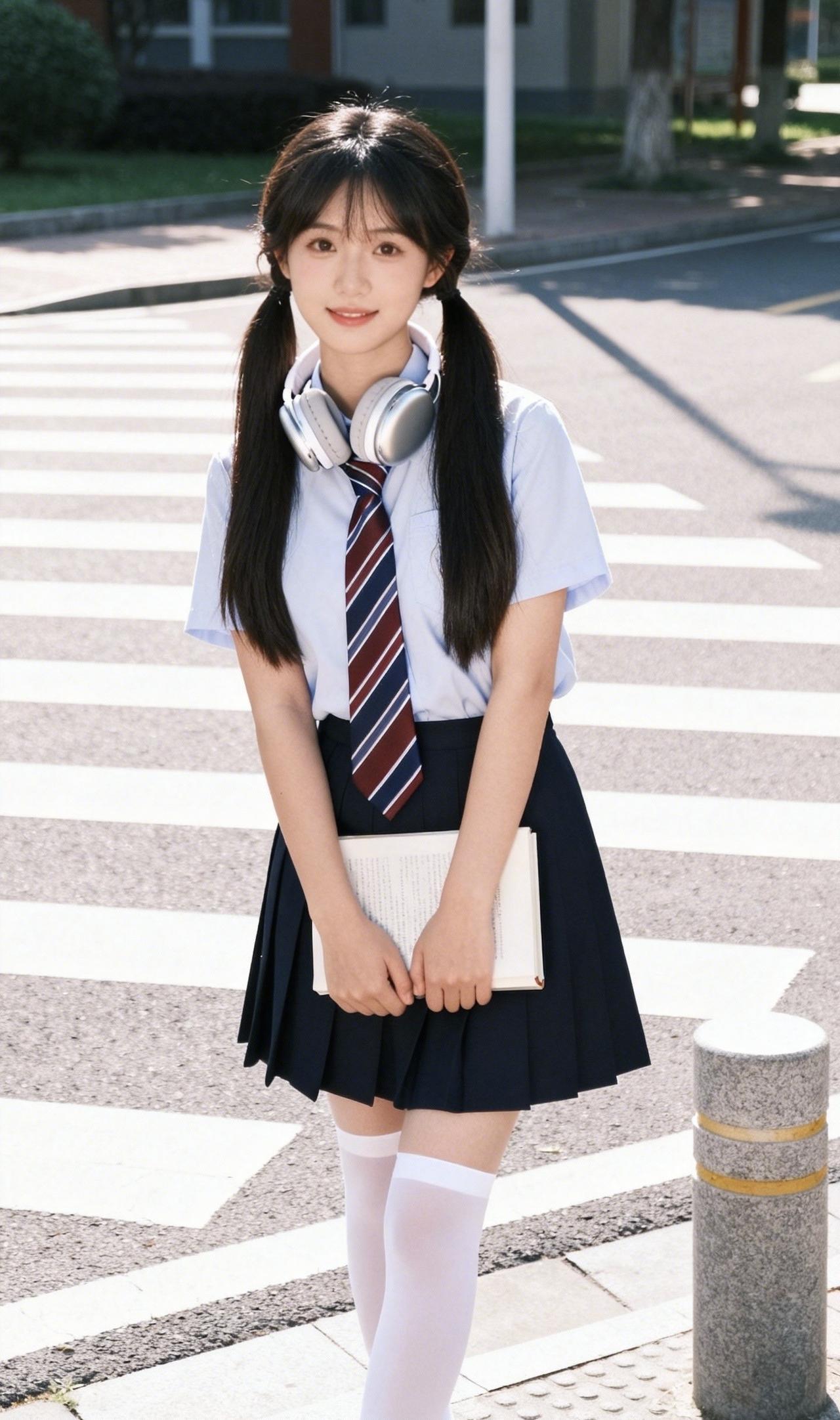 青春校园风,蓝白校服少女,手机相伴,阳光正好。