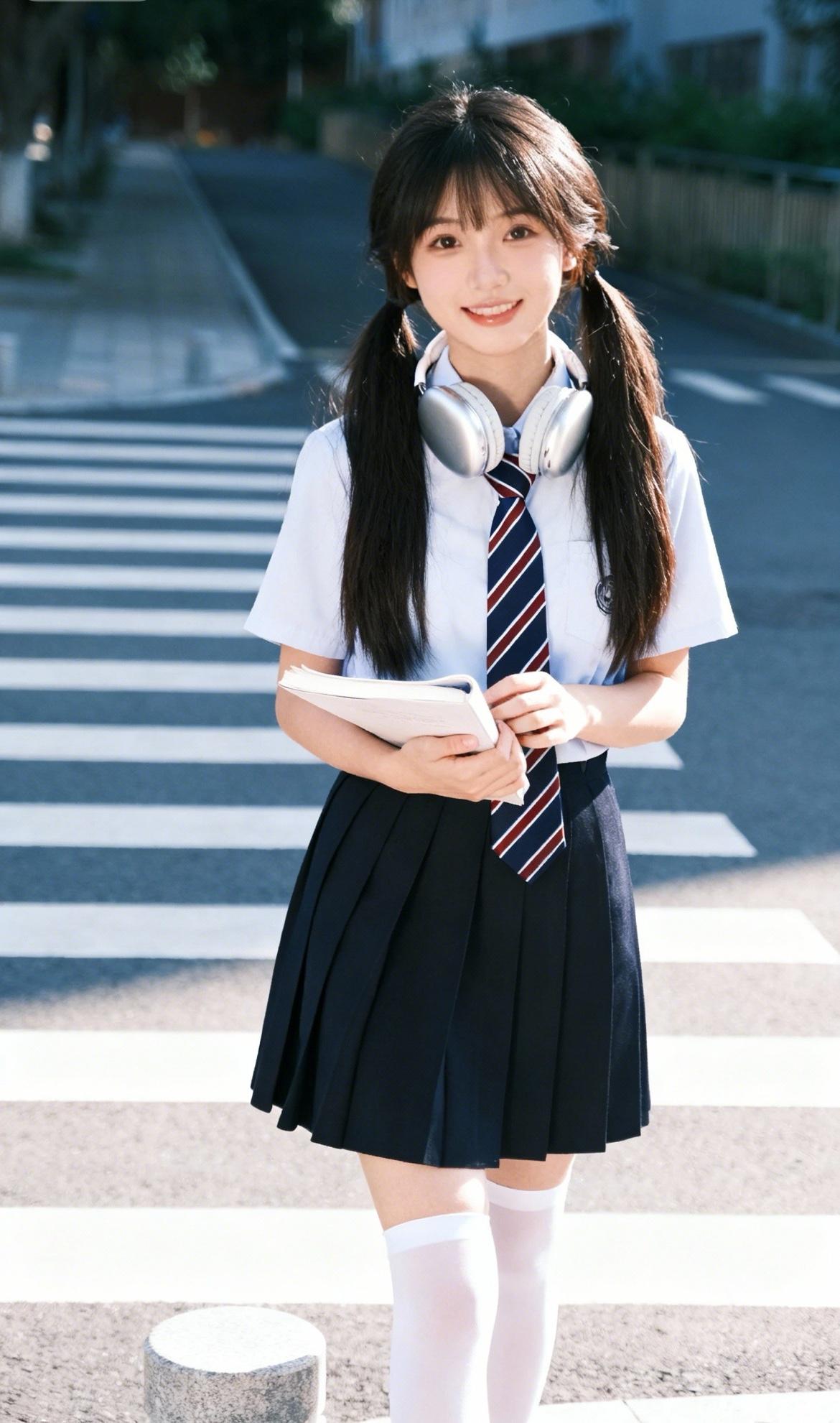 青春洋溢的校园少女,背着书包,戴着耳机,走在斑马线上。少女的笑容 清新口罩少女