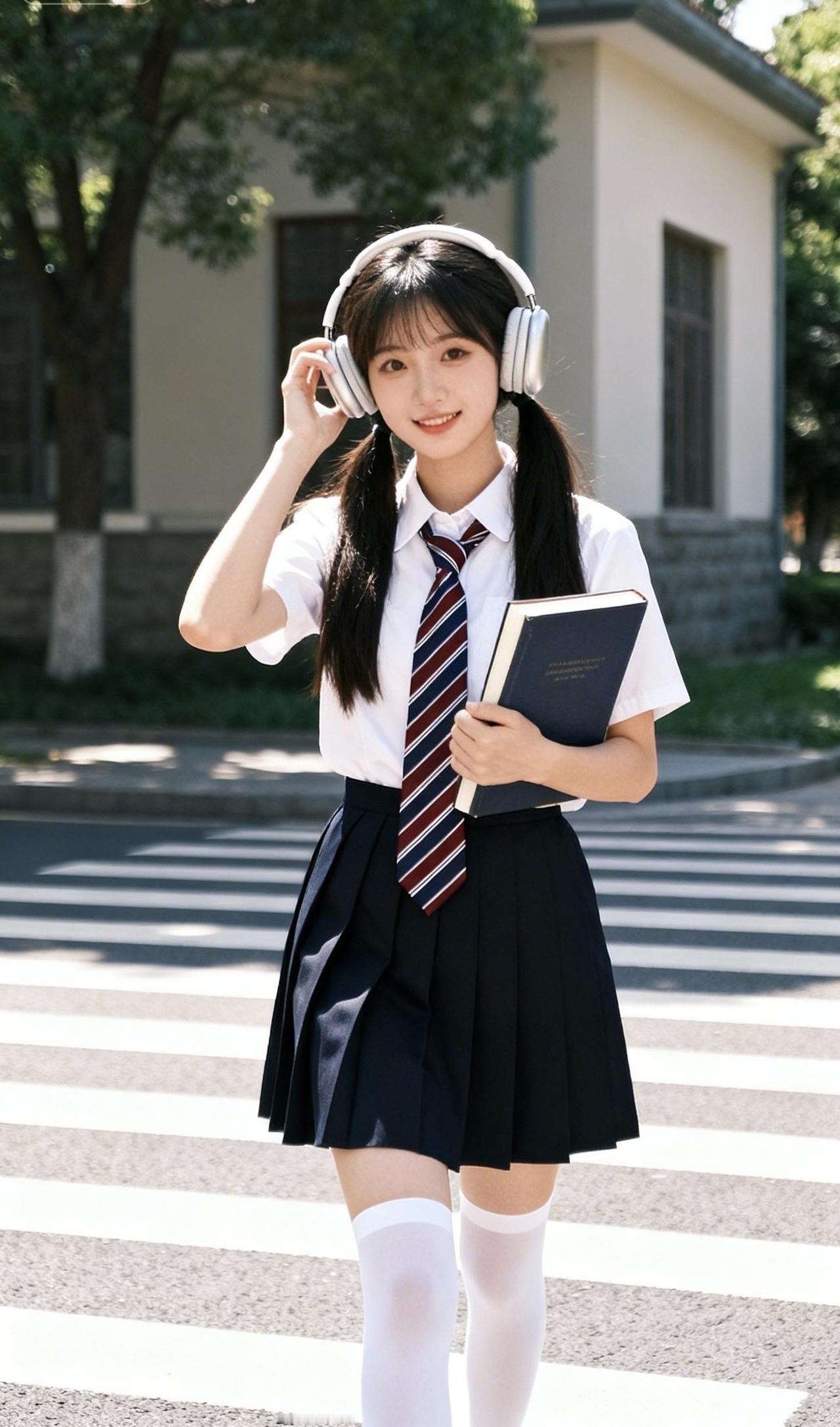 青春洋溢的校园少女,背着书包,戴着耳机,走在斑马线上。少女的笑容 清新口罩少女 校园少女
