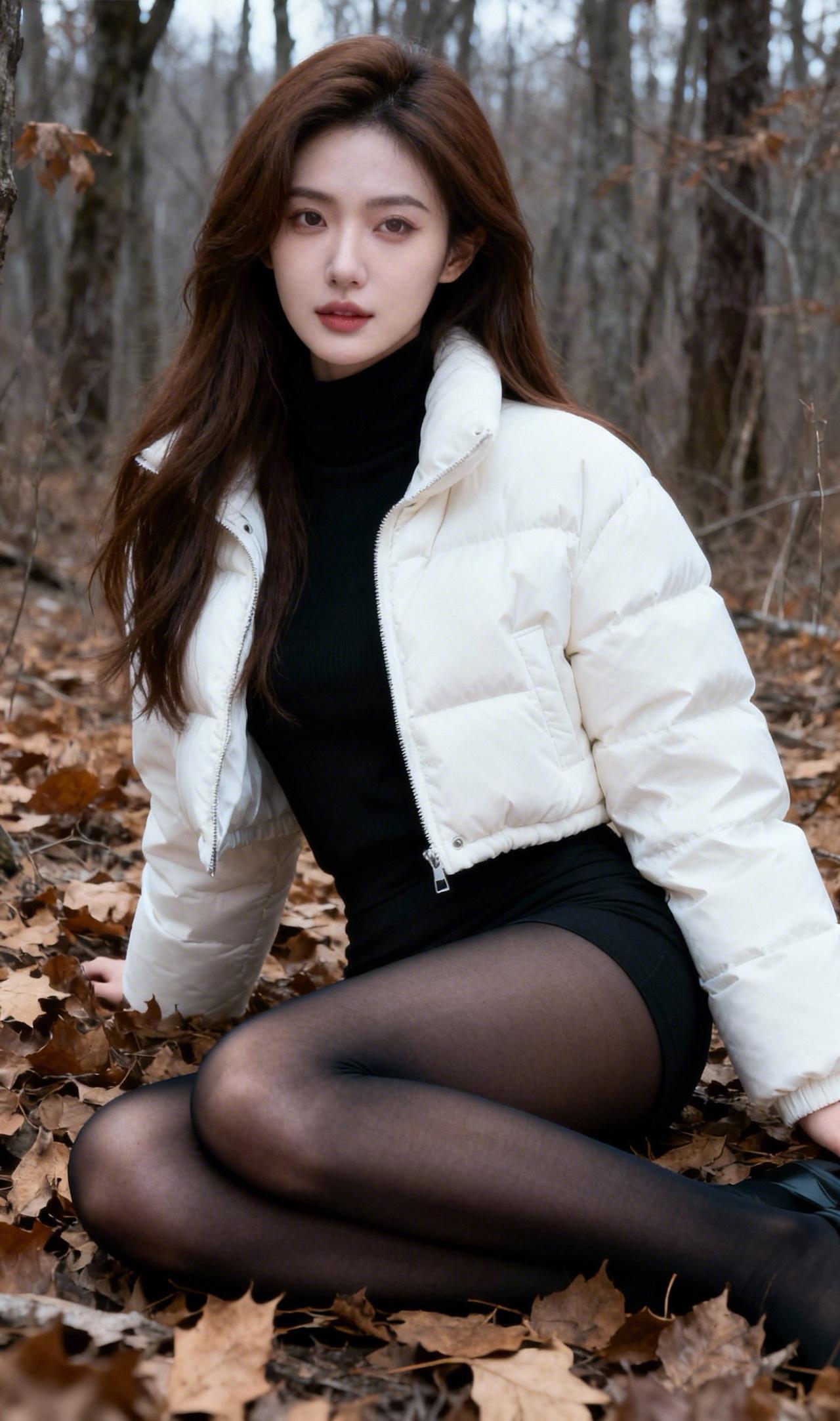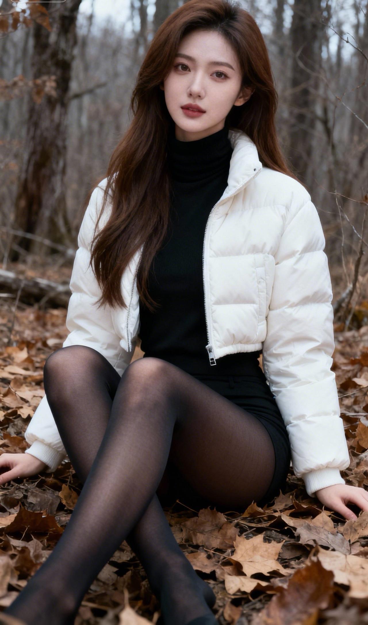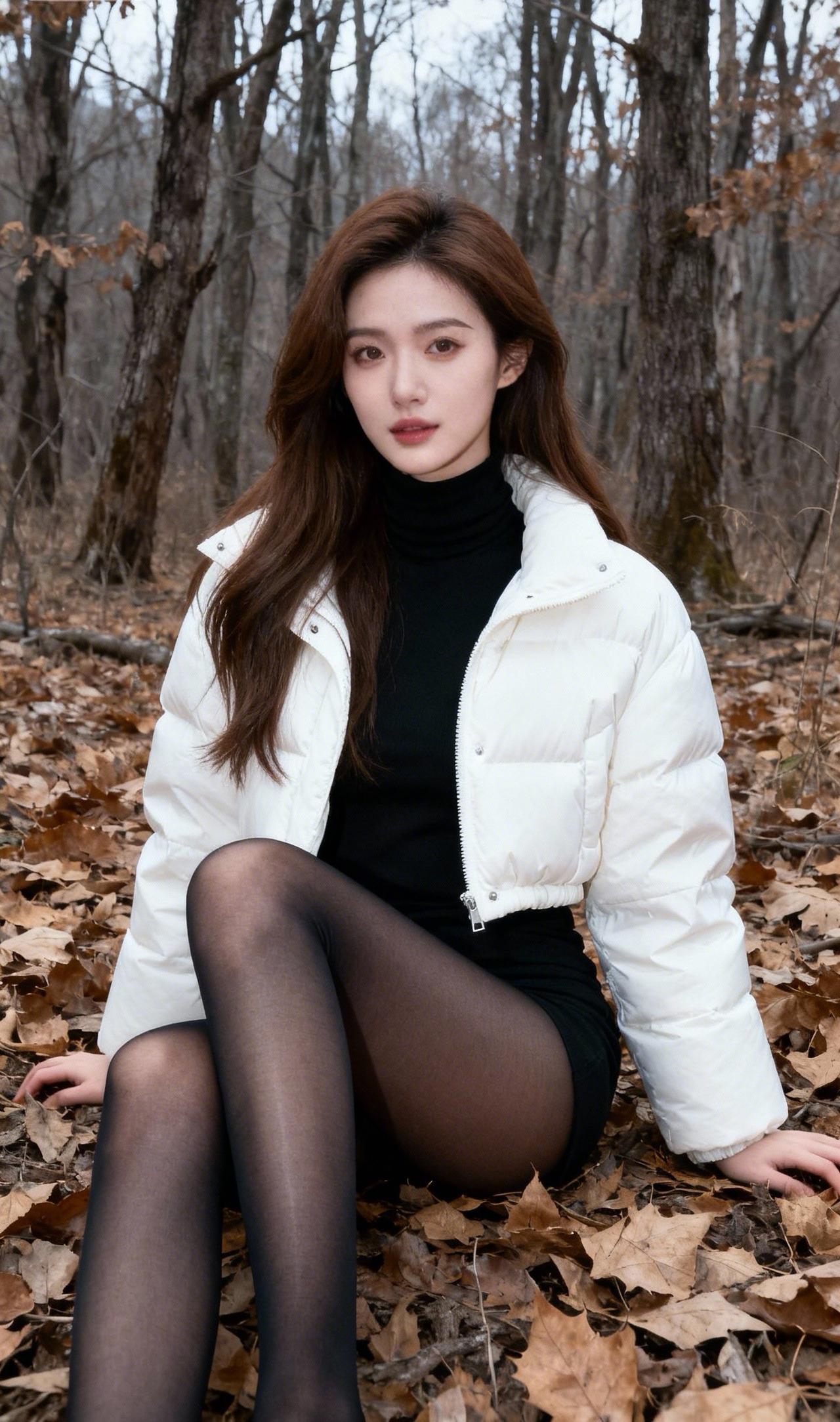 秋日森林中的时尚少女,白色羽绒服与黑色丝袜的完美搭配,尽显优雅与温暖。黑丝套白袜穿搭
