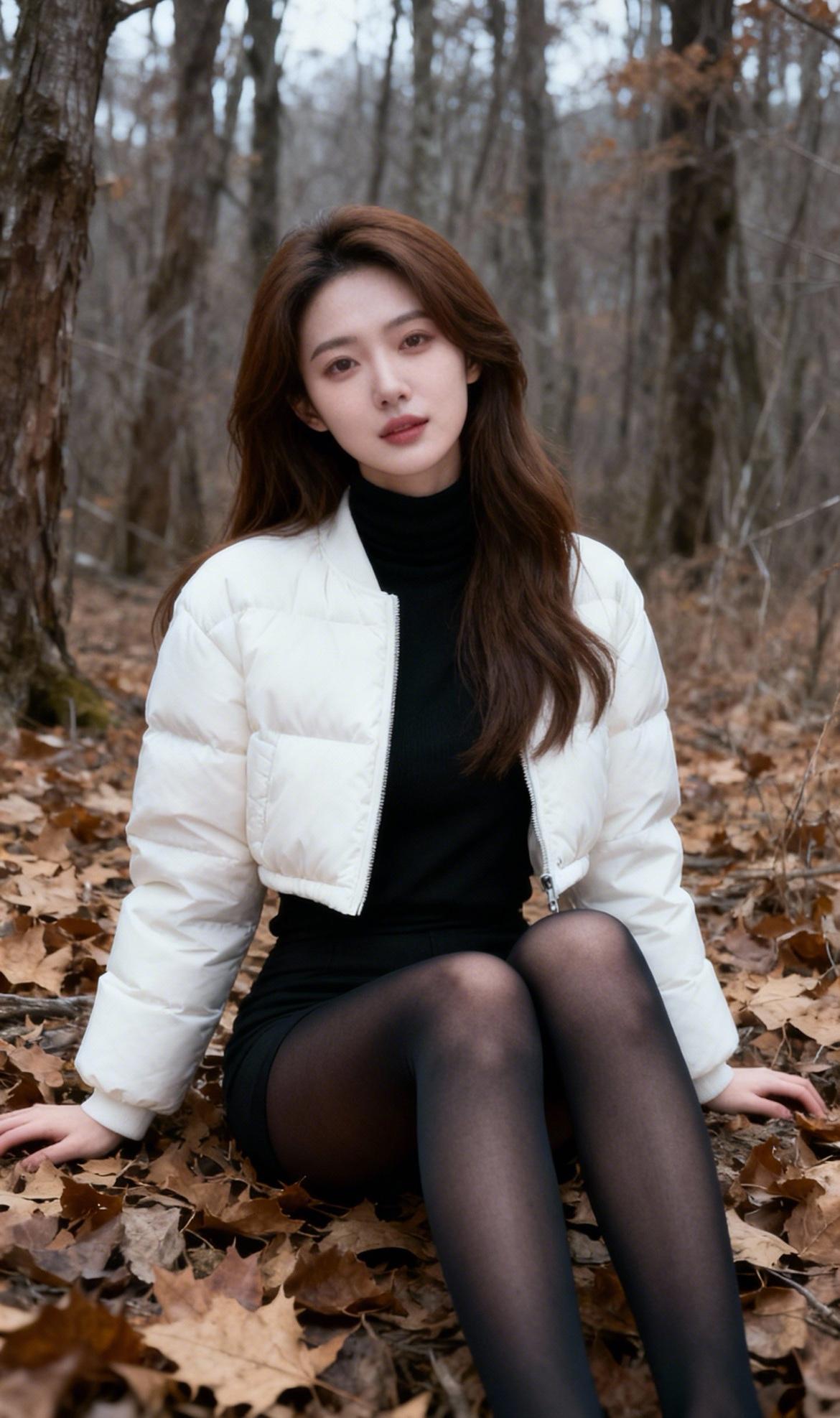 秋日森林中的时尚少女,白色羽绒服与黑色丝袜的完美搭配,尽显优雅与温暖。黑丝套白袜