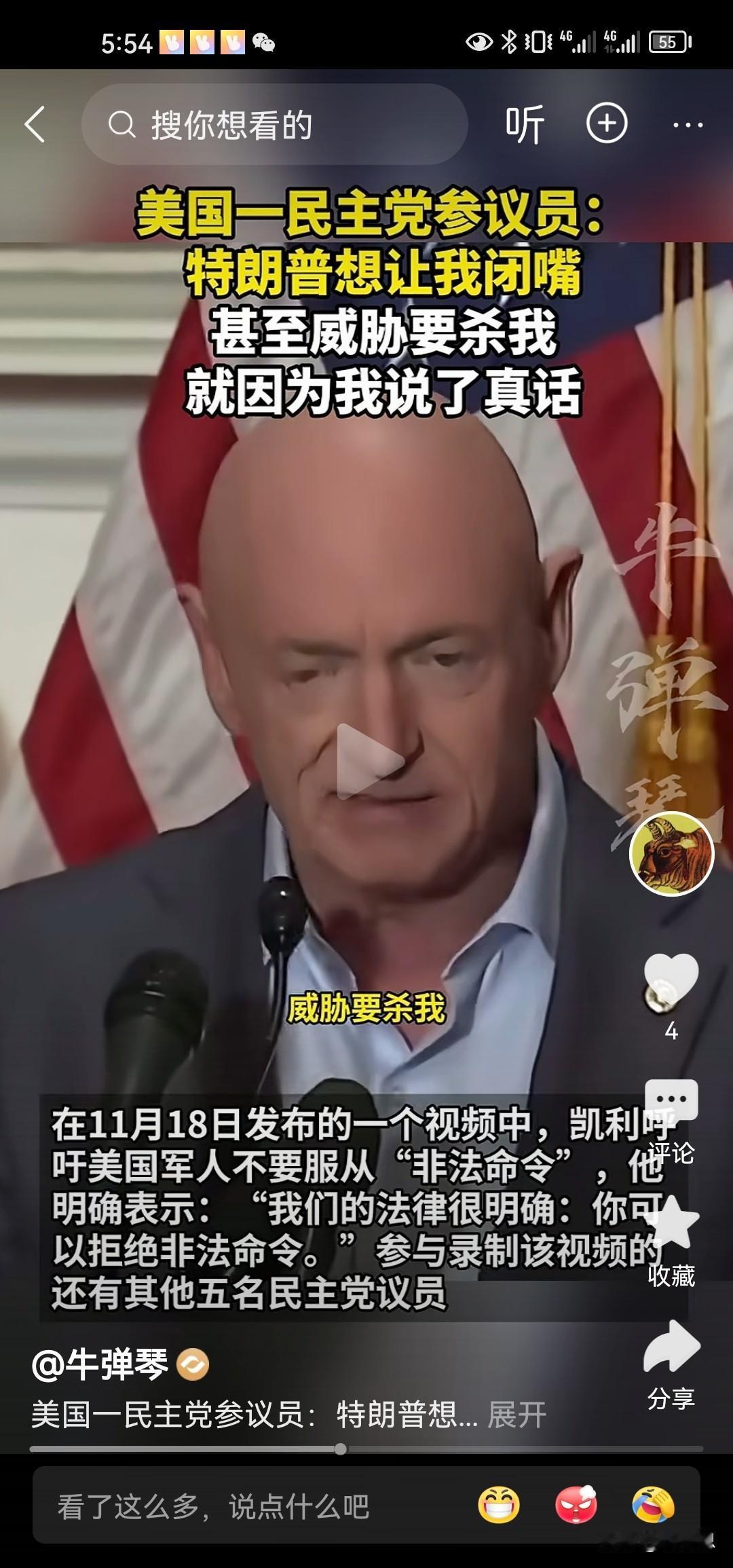 美国一名资深民主党议员公开发视频说美国总统特朗普威胁要杀了他,因为他说了真话。为什么说了真话?因为这名民主党员煽动美国军人不要听特朗普非法的命令啊,因为美国宪法规定军人可以执行非法命令。至于什么是非法合法,那就说不清楚了,很可能就是特朗普准备对委内瑞拉动武,民主党在反对,说到底这是美国党争问题啊,毕竟是共和党与民主党的斗争还在继续。目前民主党处于下风。