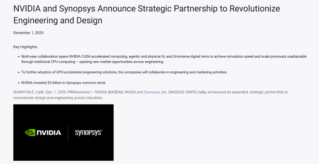 当地时间12月1日,英伟达与新思科技宣布扩大战略合作伙伴关系。此次深化合作将整合英伟达的AI与加速计算优势,与新思科技市场领先的工程解决方案强强联手,提供更精准、更快速、成本更低的智能产品设计、仿真与验证能力。同时,英伟达还以每股414.79美元的价格,向新思科技普通股投资20亿美元。