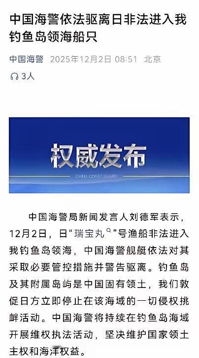 澳大利亚广播公司今天(12月2日)报道:“今日凌晨,中日在一处存在主权争议的岛屿附近发生海上对峙——中国称该岛为钓鱼岛,日本称为尖阁诸岛。双方对事件的描述存在明显分歧。中国海警表示,一艘日本渔船‘非法进入钓鱼岛海域’,随后被中方海警驱离。但日本海上保安厅则称中方两艘海警船‘接近日本渔船’,日方随即进行拦截并将中方船只驱离。” 钓鱼岛及其附属岛屿自古以来就是中国固有领土,主权归属历史经纬清楚,法理依据确凿,何来主权争议之说?中国海警局发言人刘德军表示,12月2日,日方“瑞宝丸”号渔船非法进入我钓鱼岛临海,中国海警舰艇依法对其采取管控措施并警告驱离。日本海上保安厅满嘴谎言,歪曲事实,中方海警船从吨位、碰撞能力以及武器配备等诸方面,比日方的海巡船高出不止一个档次,日本海上保安厅用什么拦截?尤其是日本首相高市早苗发表涉台错误言论之后,中方的反制还在进行之中,日方还敢没事找事?