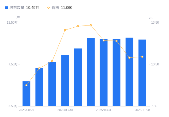 日期A股户数(户)流通A股户均持股数(股)户均持股市值(万元)2025-11-2810487910602.2811.732025-11-2010704510387.7511.422025-11-1010538310346.2012.612025-10-3110578710306.6912.612025-10-2010688910200.4313.592025-10-109422511571.3915.332025-09-308615812654.8216.412025-09-197755714057.5115.102025-09-107088915379.8015.722025-08-295491019855.3717.89