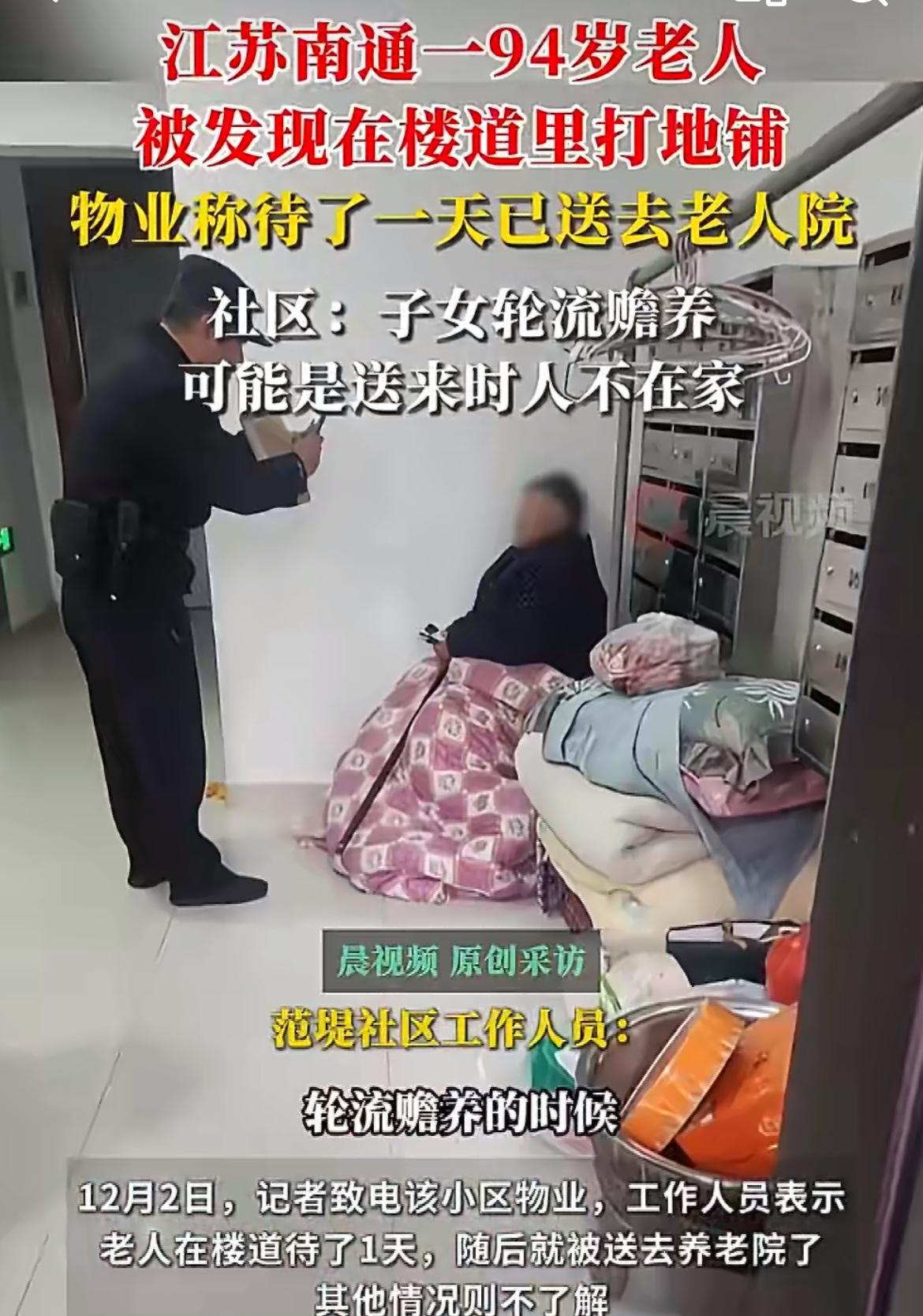 94岁老太睡楼道,5个孩子赡养不了一个人,看看南通这个家庭,所谓的多子多福,最后就是扯皮、推诿甩锅,94岁的老太成了多余的人。搞笑的是,家属竟然解释是送老太去其中一个子女家生活时,恰逢家里没人。这种骗鬼的话谁信,大冬天让94岁的老人在冰冷的楼道待着,简直丧良心。无人赡养的老人