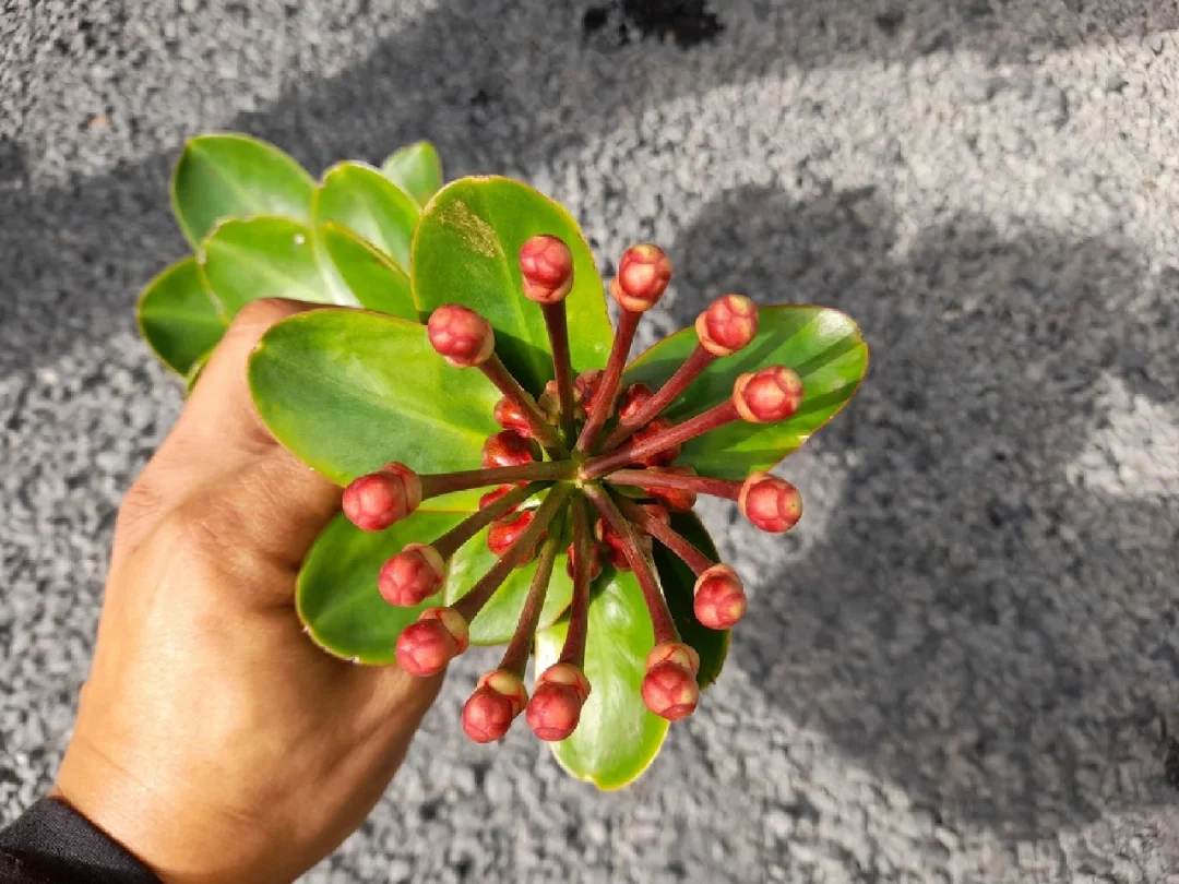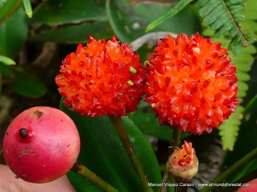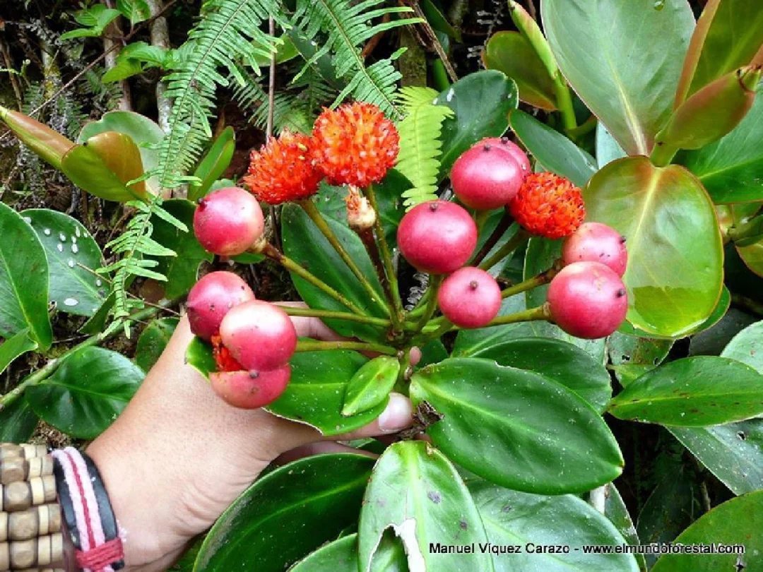 一种艳丽的附生灌木或藤蔓植物,产于中美洲和南美洲西北部,生长在低海拔和中等海拔的雨林中。它的叶子是椭圆形的,上面是深绿色,下面是浅绿色,小而直立,呈黄绿色,花s、 接着是一簇簇圆形、深红色的水果。