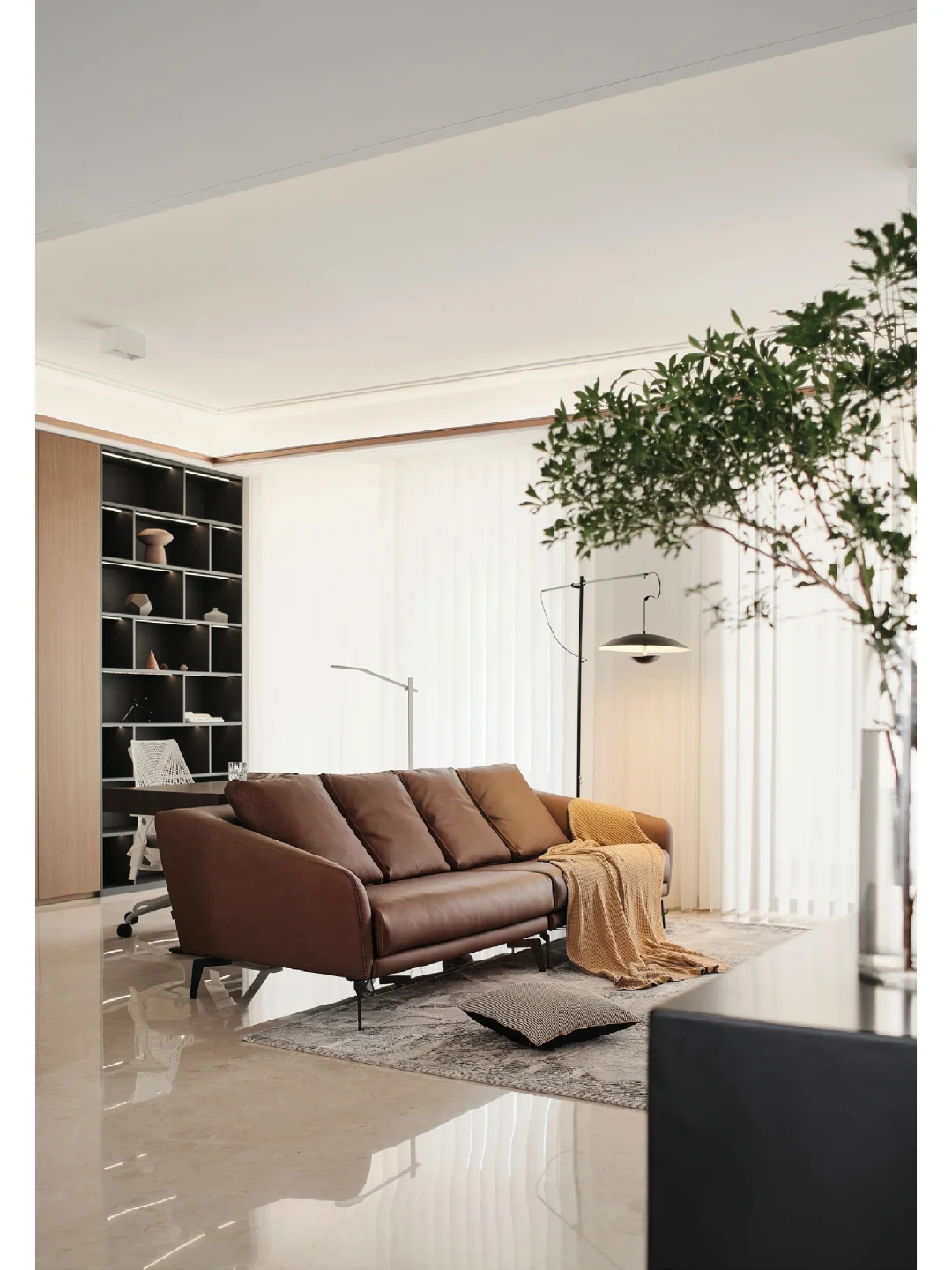 ☀️沙发选择赭褐色皮质高脚沙发,比起落地沙发,高脚沙发拥有更加直观的高级质感。沙发背后留出空间做了一个小型的书房空间,定制的开放格收纳柜满足日常的收纳需求与办公需求。
