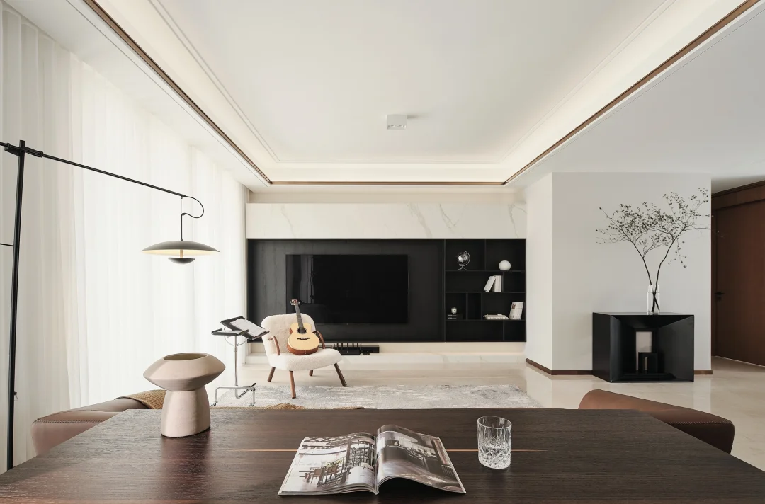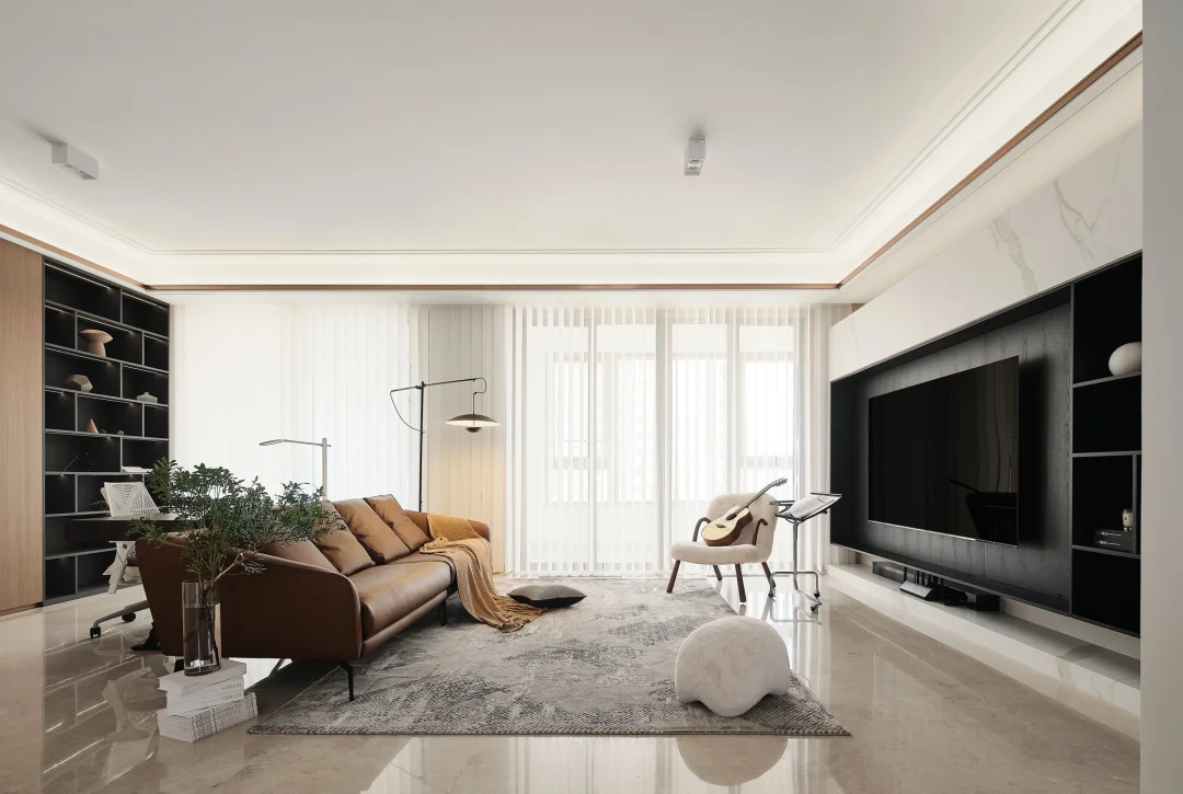 ☀️客厅以白色为主,赭褐色和黑色作为重要组成部分。电视背景墙做的悬浮的设计,减轻了头重脚轻的不协调感。黑白墙体柜体可以实现自然过度,不必再多加修饰,自然大方展现格局之美。