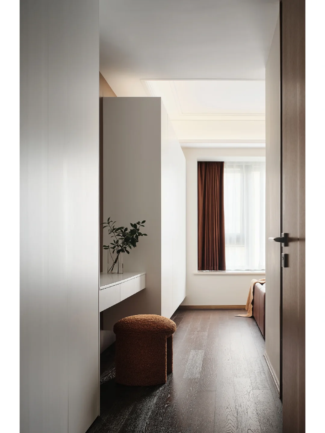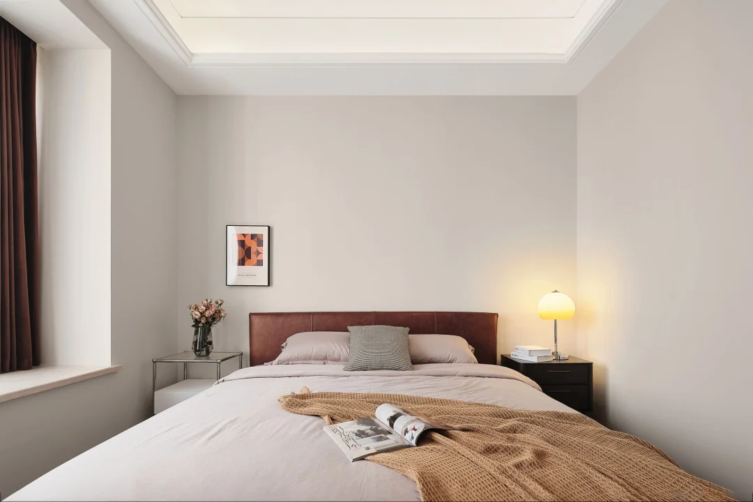 ☀️主卧的基调和客厅风格一致,极致典雅,现代高级。在装饰上没有做很多出格设计,室内所有的一切都是协调的绝佳答案,不可多不可少,恰好即是最好。将一侧的定制柜子做的悬浮的设计,底部留空方便室内的采光照明空间的每个角落。利用这个小空间做的梳妆台的设计,满足女主人日常的使用。