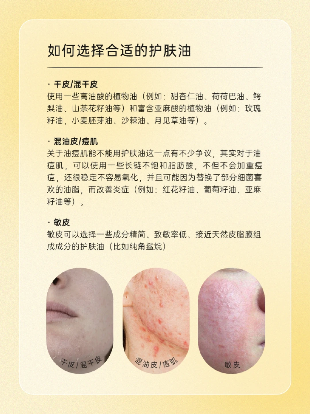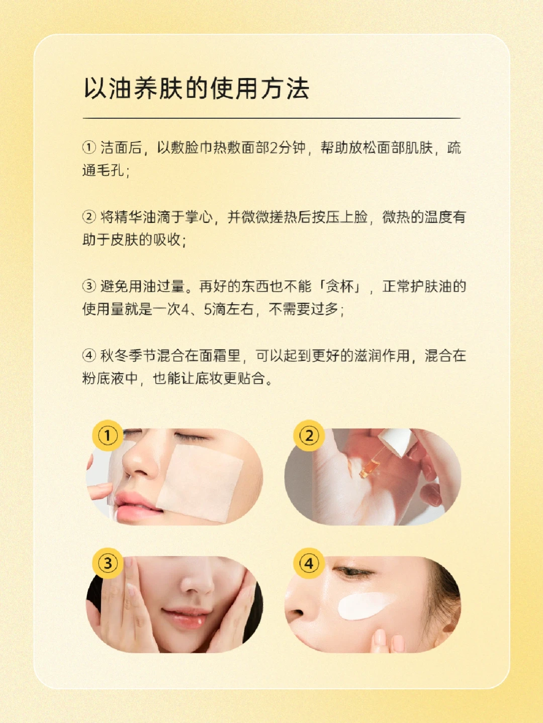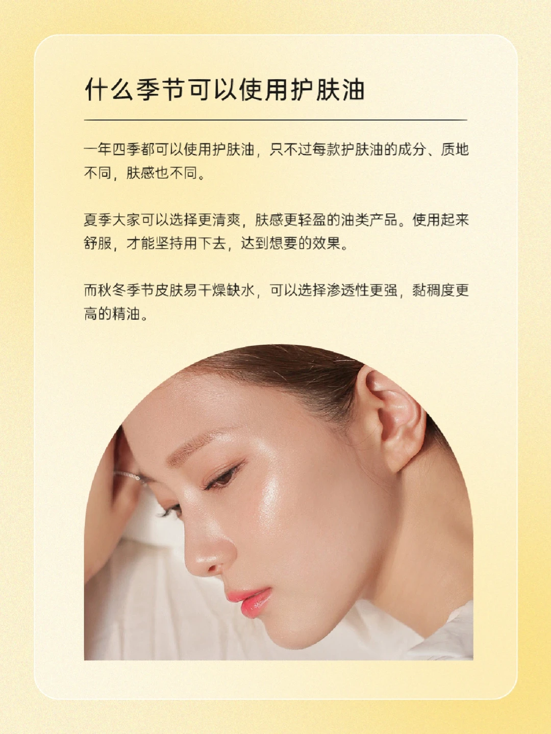 💛什么是以油养肤? 💛以油养肤的作用 💛如何选择合适的护肤油、? •不同肤质可以根据需求选择不同的护肤油 💛什么季节可以使用护肤油? •一年四季都可以使用护肤油,春夏季可以选择肤感清爽的,秋冬季选择保湿力更强的精油 💛以油养肤的使用方法 一起来了解一下吧,下期还想看什么可以❤️➕🍎告诉我哦