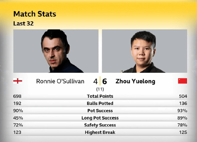 全场比赛,周跃龙打出单杆125分破百,奥沙利文打出单杆71、123、62、94分。