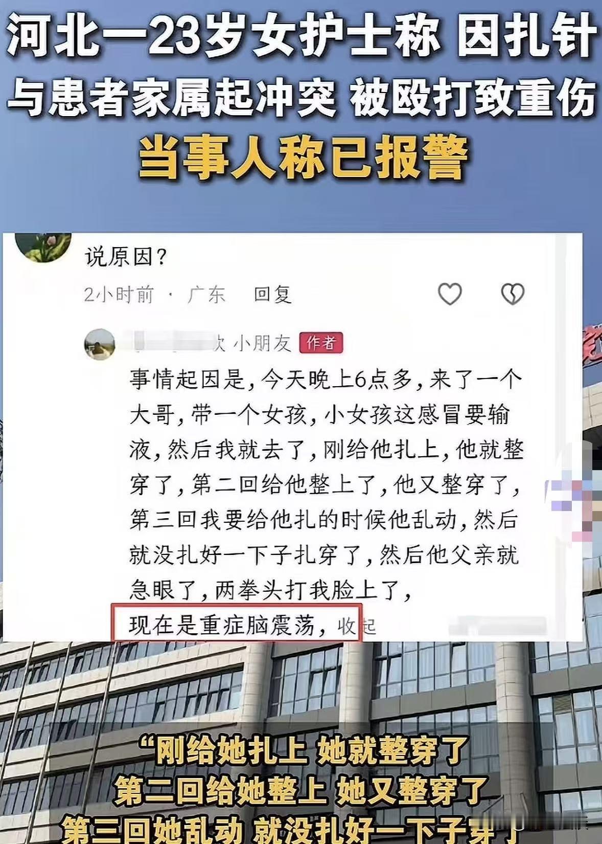 河北秦皇岛,男子带女儿去打针,小女孩害怕一直哭,护士就安慰她轻轻一下就好,不疼的,随后护士很利索就把针扎上了,但是因为女孩年龄太小不配合,动来动去一下穿了,叫来护士从新扎,没想到小女孩还是不老实,没一会又穿了,护士见状告诉女孩不能再动了,就这样又扎了一次,谁知道女孩手一动还没扎上就穿了,护士也被吓了一跳,还没她说话,女孩父亲却突然发飙,二话没说照着护士的脸就是两拳,直接导致小护士重度脑震荡,太阳穴骨裂,耳膜出血,下巴脱臼。 男子女儿感冒发烧还咳嗽,想着去打针效果会快一些。 但小孩都怕打针,小姑娘一进打针的诊室,就开始哇哇大哭,嘴里还喊着不要打针,不要打针。 护士小林刚给其他小朋友打完针,看见女孩进来就开哭,一边准备针剂,一边柔声细语地安慰她: 宝贝不怕,就轻轻一下,嗖的一下就好了,一点都不疼的,乖啊。 安抚了几句,小林看孩子情绪稍微稳了一点,就准备动手。 她让孩子父亲帮忙压一下,然后一下就把针扎了上去。 可谁成想,这小女孩太小,看针扎进去了别害怕,一直哭,扭来扭去的也不老实。 没动几下,针一下子就穿了,按道理来说这也是打针时小孩不配合常出现的情况。 小林见状,赶紧过来查看,毕竟孩子小,也没多说啥,就跟孩子爸爸说:哥,你稍微把孩子抱稳一点,我再给重新扎一次。 孩子爸爸当时也没说啥,就按着孩子的手,第二次,小林一下又扎了上去。 可这小女孩估计是刚才穿了一次有点疼,心里更害怕了,挣扎得更厉害,没一会功夫,这第二针也穿了。 此时小林脸上也有点无奈,但依然耐着性子蹲下来,看着小姑娘的眼睛,认真地跟她说: 宝贝,咱们不能再动啦,再动的话还要再扎一次,会更疼的,听话好不好? 这次扎完咱们一动不动,很快就能打完,打完你就好了,不咳嗽也不难受了。 然后就开始第三次扎针,小林都有点紧张了,她屏住呼吸,找准了血管慢慢往里进针。 可没想到女孩小手猛地一动,这针还没完全扎上呢,又穿了。 这一下,连小林自己都被吓了一跳,说实话她也没遇到过连续三次都因为孩子动而穿针的情况,一时之间也有点懵。 站在那儿还没来得及说话,想着该怎么跟家长解释,或者怎么再安抚孩子。 万万没想到,孩子父亲看着女儿扎了3针还没有扎上,又心疼又生气。 他觉得都是护士的原因,是她技术不行才让女儿白白受苦。 随后竟然直接发飙,他二话没说,抡起拳头照着小林的脸就打了过去。 咣咣两拳,这两拳可是真够狠的,直接就把小护士打倒在地。 周围的人都没反应过来,等反应过来想去拉架的时候,小林已经躺在地上起不来了,脸上全是血,看着都吓人。 大家赶紧把小林送去检查,结果出来之后,大家都倒吸一口凉气: 重度脑震荡,太阳穴骨裂,耳膜出血,下巴还脱臼了。 这得多重的力道才能造成这么严重的伤害,小林为此委屈不已。 她觉得从头到尾自己并没有错,是孩子不配合,连续穿针,这不是她的技术问题,主要是孩子太小、太抗拒了。 她全程都在耐心安抚,没有一句怨言,没有一点不耐烦。 结果就因为连续三次没扎成功,就被家长这么暴打一顿,落得这么严重的伤,这也太冤了! 还有那个小女孩,她虽然年纪小,不懂事,但这事对她来说肯定也是一个不小的惊吓。 看着爸爸当着自己的面打人,看着护士姐姐被打得流血倒地,这对她的心理肯定会造成一定的影响。 以后她再去医院打针,会不会更害怕?会不会对医生护士产生抵触心理?这都是很难说。 都说做家长的,是孩子的第一任老师,你的一言一行都在影响着孩子。 你用bao力解决问题,孩子会不会也学着用bao力去处理事情?这都是值得深思的。 而且发生这样的事,也不会不了了之,小林表示目前已经报警。 《刑法》第234:故意伤害他人身体的,处三年以下有期徒刑、拘役或者管制,致人重伤的,处三年以上十年以下有期徒刑。 护士小林被打成重度脑震荡、太阳穴骨裂等,这些伤情已远超轻伤标准,达到“重伤”级别。 男子明知挥拳打脸会造成伤害,仍故意实施该行为,完全符合故意伤害罪。 《民法典》第1179条:侵害他人造成人身损害的,需赔偿医疗费、护理费、交通费、营养费等为治疗和康复支出的合理费用,以及因误工减少的收入。 男子的殴打行为直接导致护士小林受伤,小林后续治疗产生的医疗费、休养期间的误工费等一系列费用,都有权向该男子索赔,男子必须承担全额民事赔偿责任。 这也不的不说一句,遇事一定要冷静,千万不能冲动行事。 情绪失控的时候,很容易做出一些让自己后悔一辈子的事情。 不管遇到什么问题,都要选择合理合法的方式去解决,沟通永远是最好的桥梁。 有话好好说,有问题好好解决,没必要非得争个高低对错,更没必要动手打人。 那么,你如何看待护士小林遭遇的这件事呢? @静心法谈 学法辨是非,慬法不吃亏。