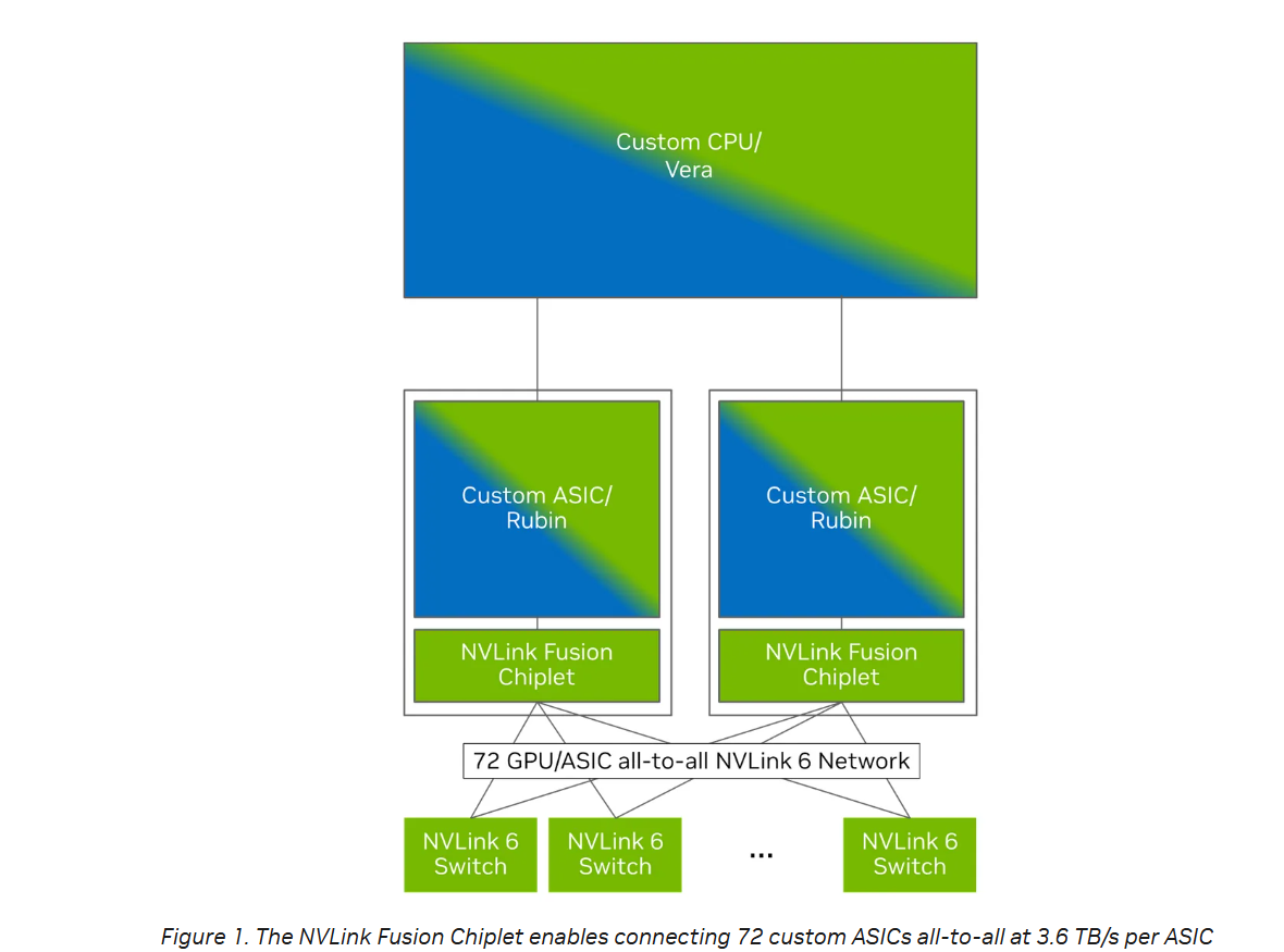 英伟达介绍称,NVLinkFusion的核心是NVLinkFusionchiplet,超大规模云服务商可以将该chiplet嵌入其定制ASIC设计中,以连接NVLink规模化互联和NVLink交换机。