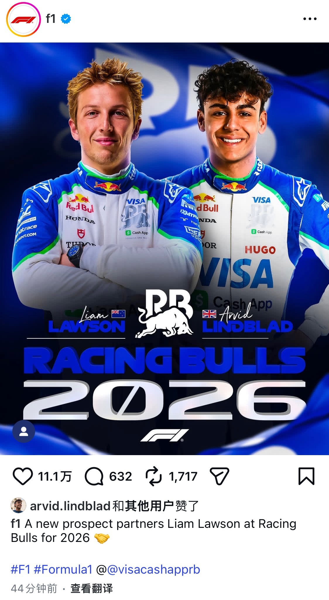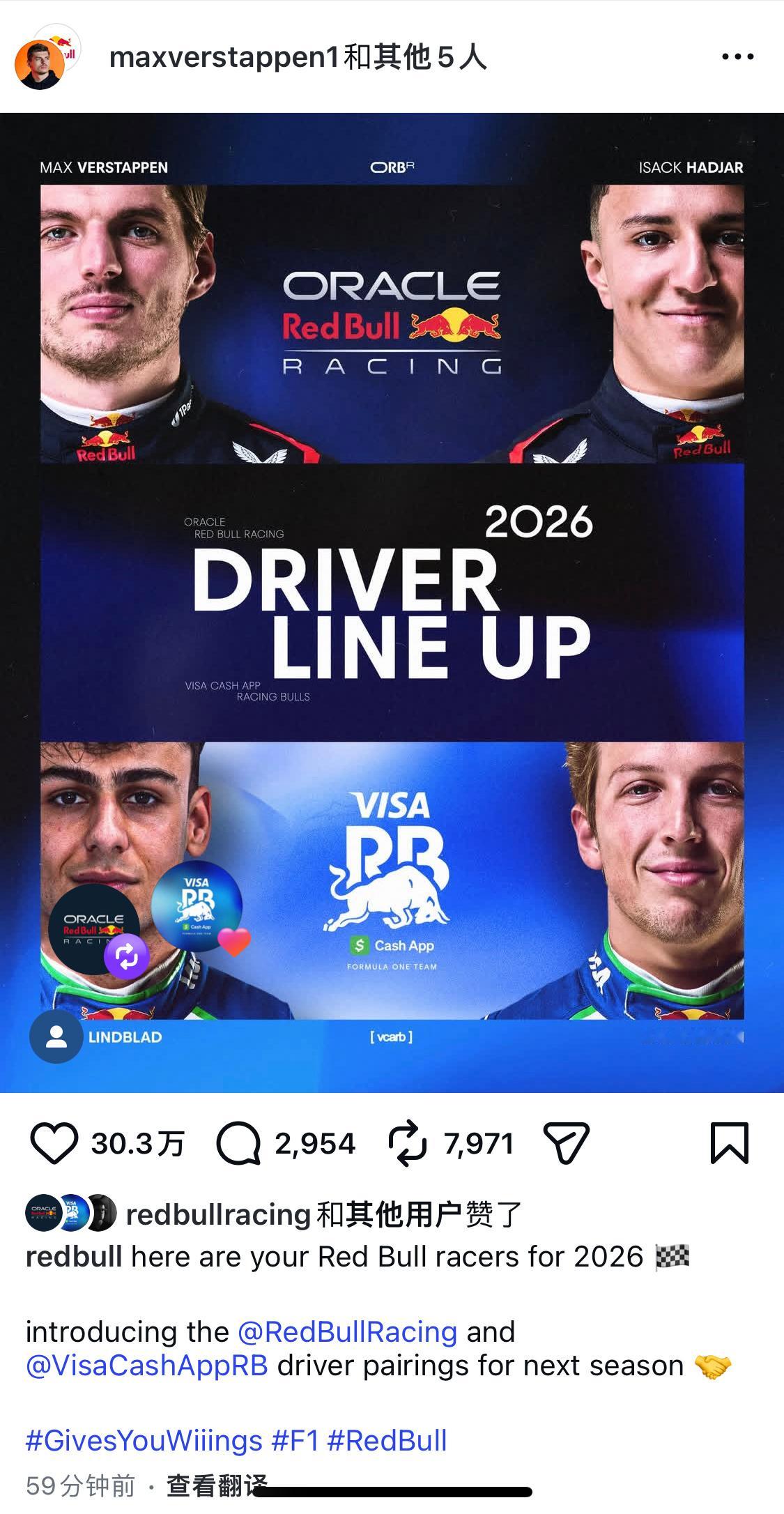 红牛官宣2026赛季车手阵容 真的宣了!man包下放大牛!莉莉面包be了🙃F1