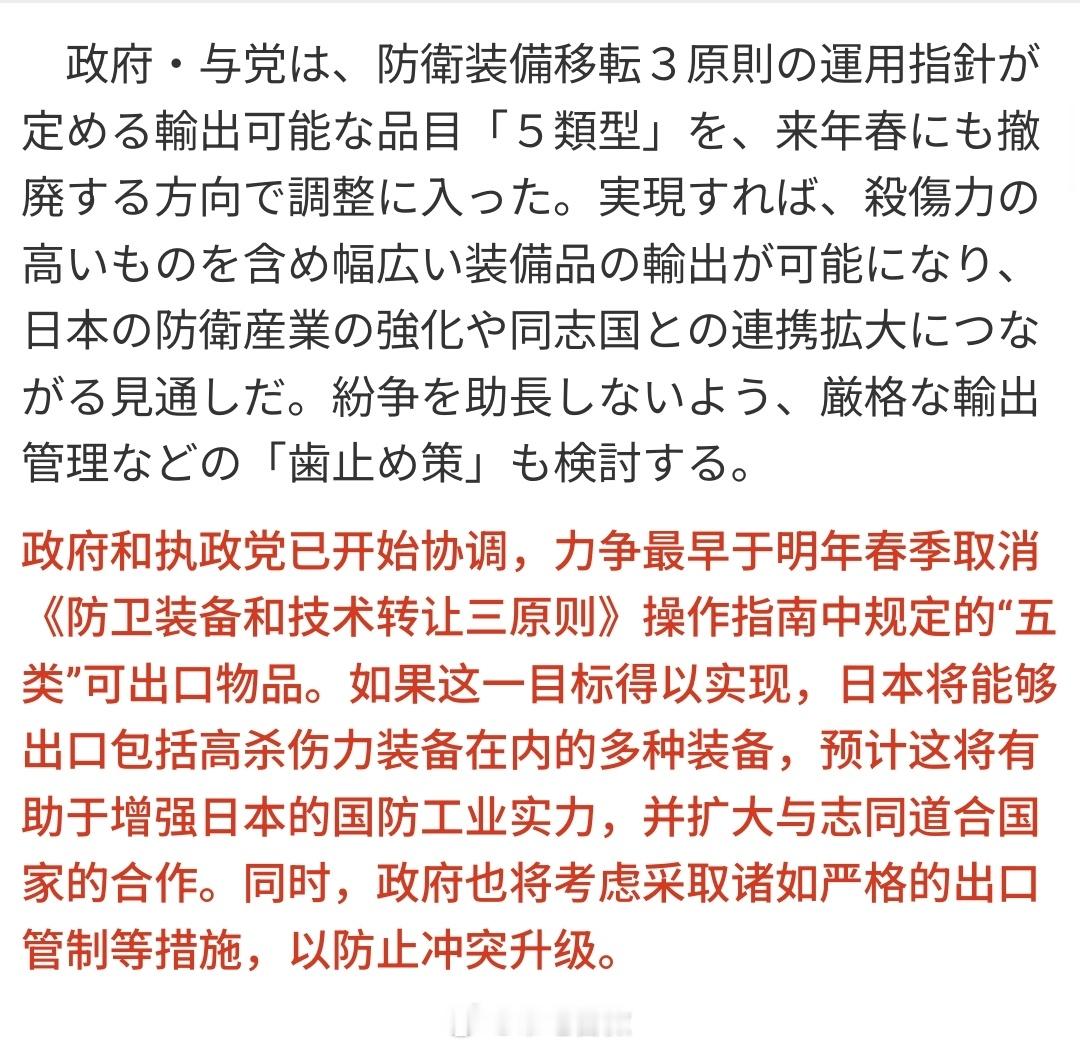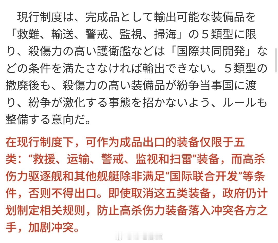 不演了,日本决定于明年春季废除防御装备输出五原则,进而谋求输出杀伤性武器和护卫舰等。⭐从安倍改安保法开始,日本日拱一卒慢慢把战败条款全部改完了,未来的野心很膨胀。日本被曝正在研发万能型血浆日本正武装菲律宾