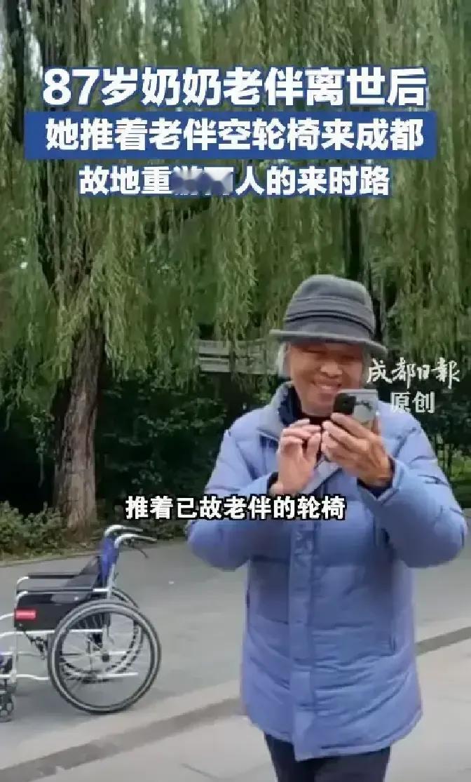 87岁郑奶奶推着空轮椅出现在成都宽窄巷子,我隔着屏幕都听见轮椅吱呀声像在说老伴我到了。 二十年前他俩在这儿啃兔头拍合照,去年老头先走一步,她把旧轮椅擦得锃亮买张高铁票就出发,没人陪也敢,一路跟轮椅商量下一站吃龙抄手还是甜水面,拍照时把轮椅摆进画面空出半边,好像老头仍坐在那儿戴鸭舌帽。 我盯着视频里她弯腰给轮子系上红绳,突然明白这不是浪漫是日常,只是把每天在家擦相框的动作搬到两千公里外,继续把两个人的日子过成一个人的班次,她没哭,镜头外的我却哭成狗。 爱不是热搜词,是把答应过的小事做完。 老头走后她每天推轮椅去楼下转圈,如今只是把圈画得大一点。 我们总把永远挂嘴边,却忘了永远就是今天替对方多看一眼世界。
