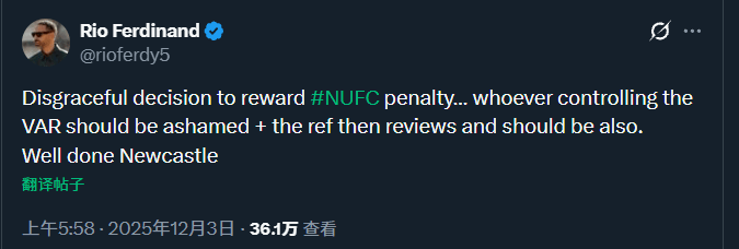 里奥-费迪南德赛后直接在社媒对裁判判罚给纽卡点球的决定开喷,言辞非常激烈。