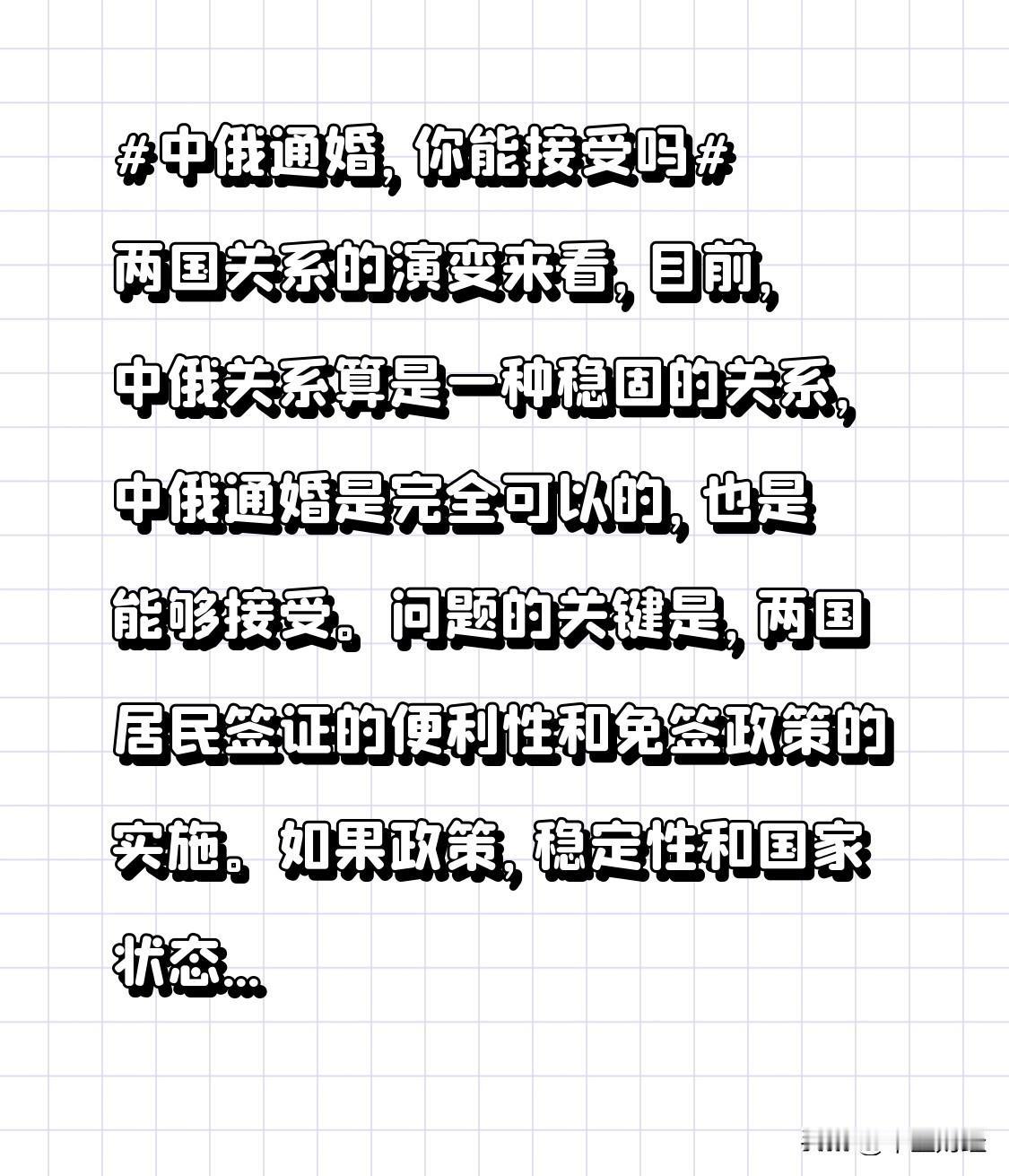 从两国关系的演变来看,目前,中俄关系算是一种稳固的关系,中俄通婚是完全可以的,也是能够接受。 问题的关键是,两国居民签证的便利性和免签政策的实施。如果政策,稳定性和国家状态的稳定,那么这种中俄通婚是有益的。相反,如果政策经常性的变化或战争形式出现急转而下,那么,这种通婚对年轻人而言就要谨慎了。关键是稳定的政策和社会环境,两国关系变化等等!中俄互免签证 中俄双边关系 中俄现状 中俄免签婚恋潮 俄中俄友谊