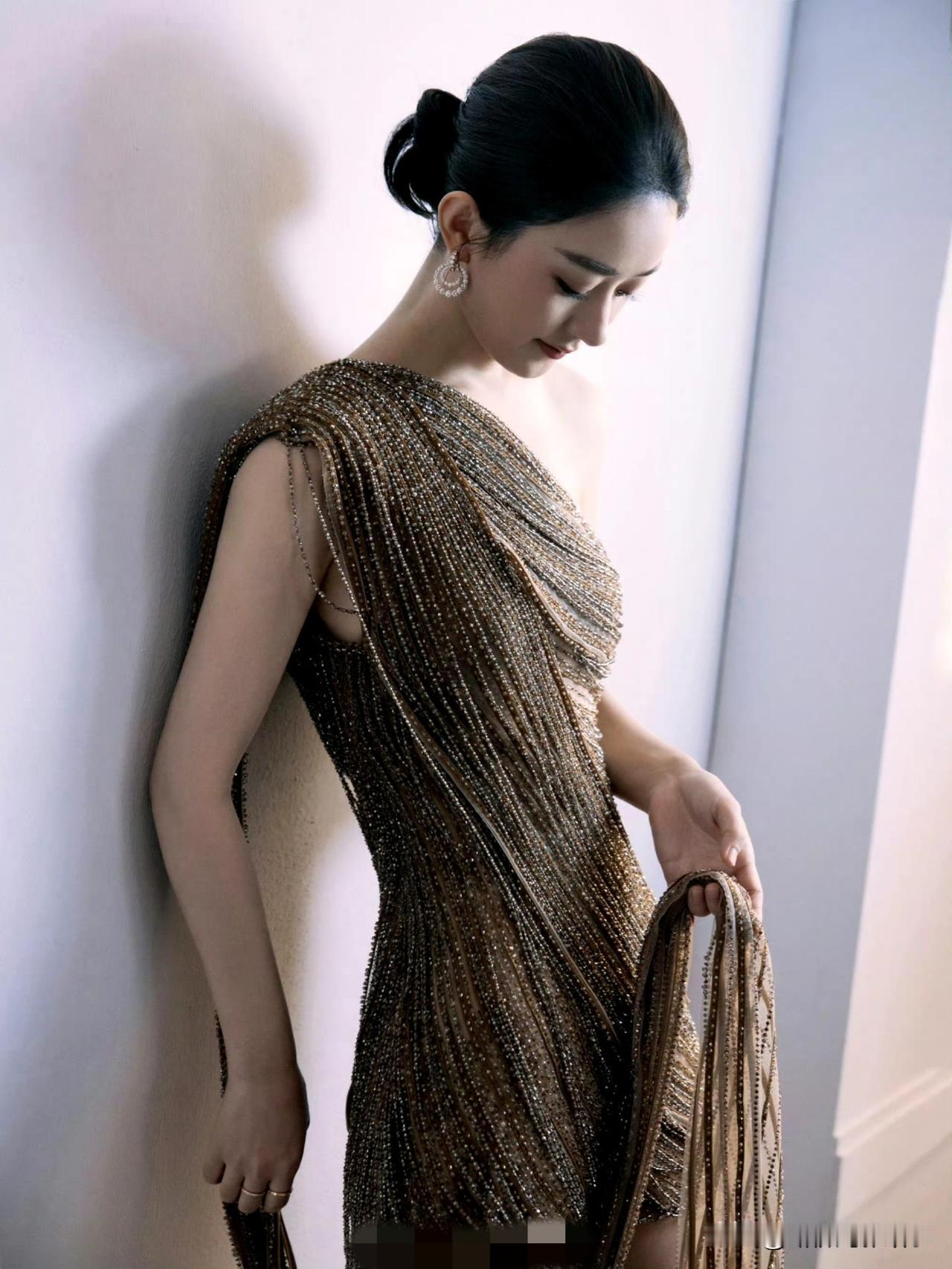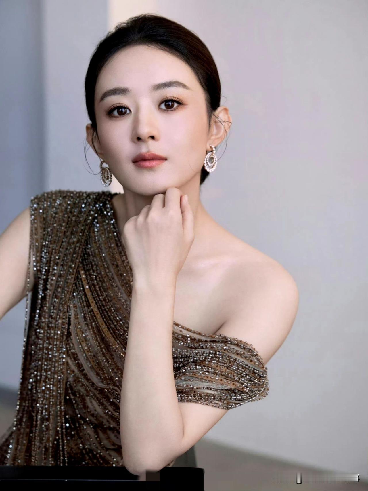 赵丽颖把直播造型穿成了“贵气模板”:Cong Tri单肩裙裹满碎钻,斜裁线条衬出