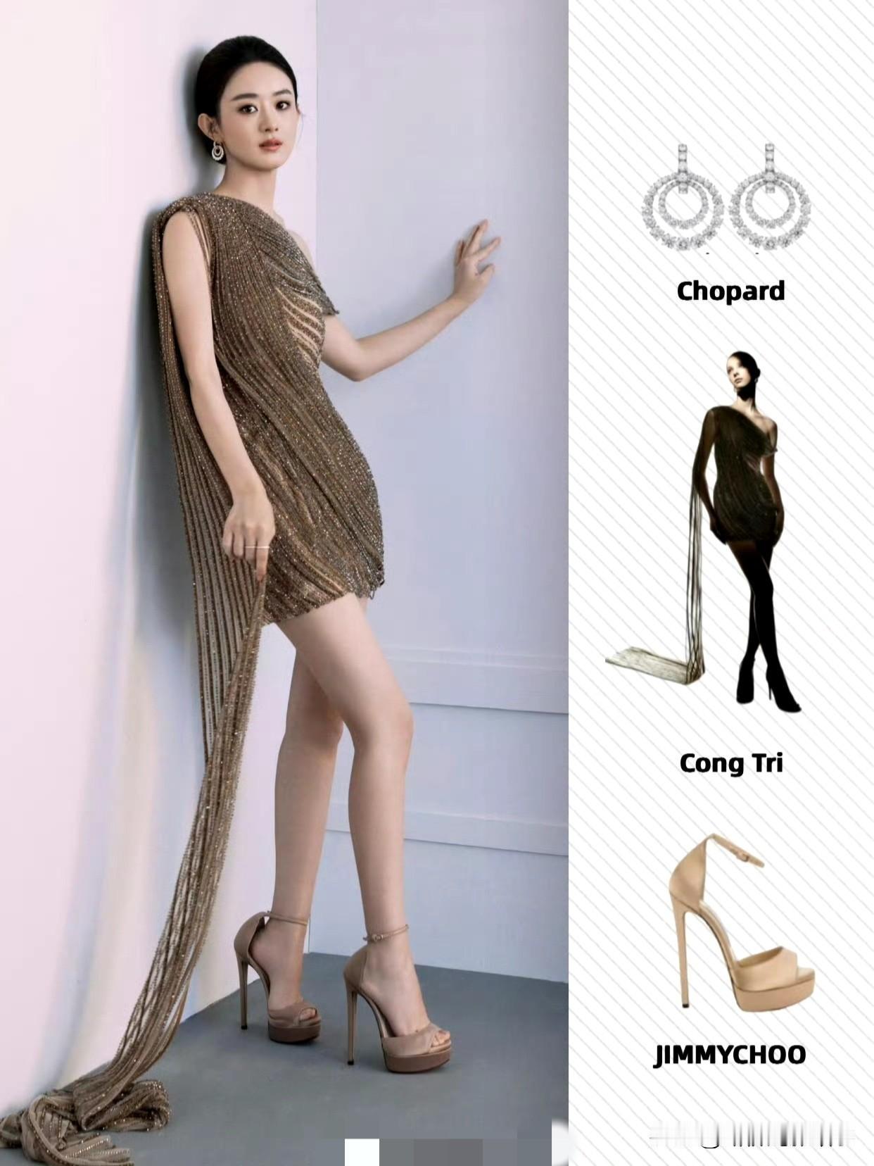 赵丽颖把直播造型穿成了“贵气模板”:Cong Tri单肩裙裹满碎钻,斜裁线条衬出肩颈,垂坠流苏添了灵动;搭Jimmy Choo厚底鞋,腿长直接拉满。 萧邦双环钻饰和盘发呼应,甜和飒掐得刚好——这哪是直播穿搭,是把高定的精致焊在了镜头里。