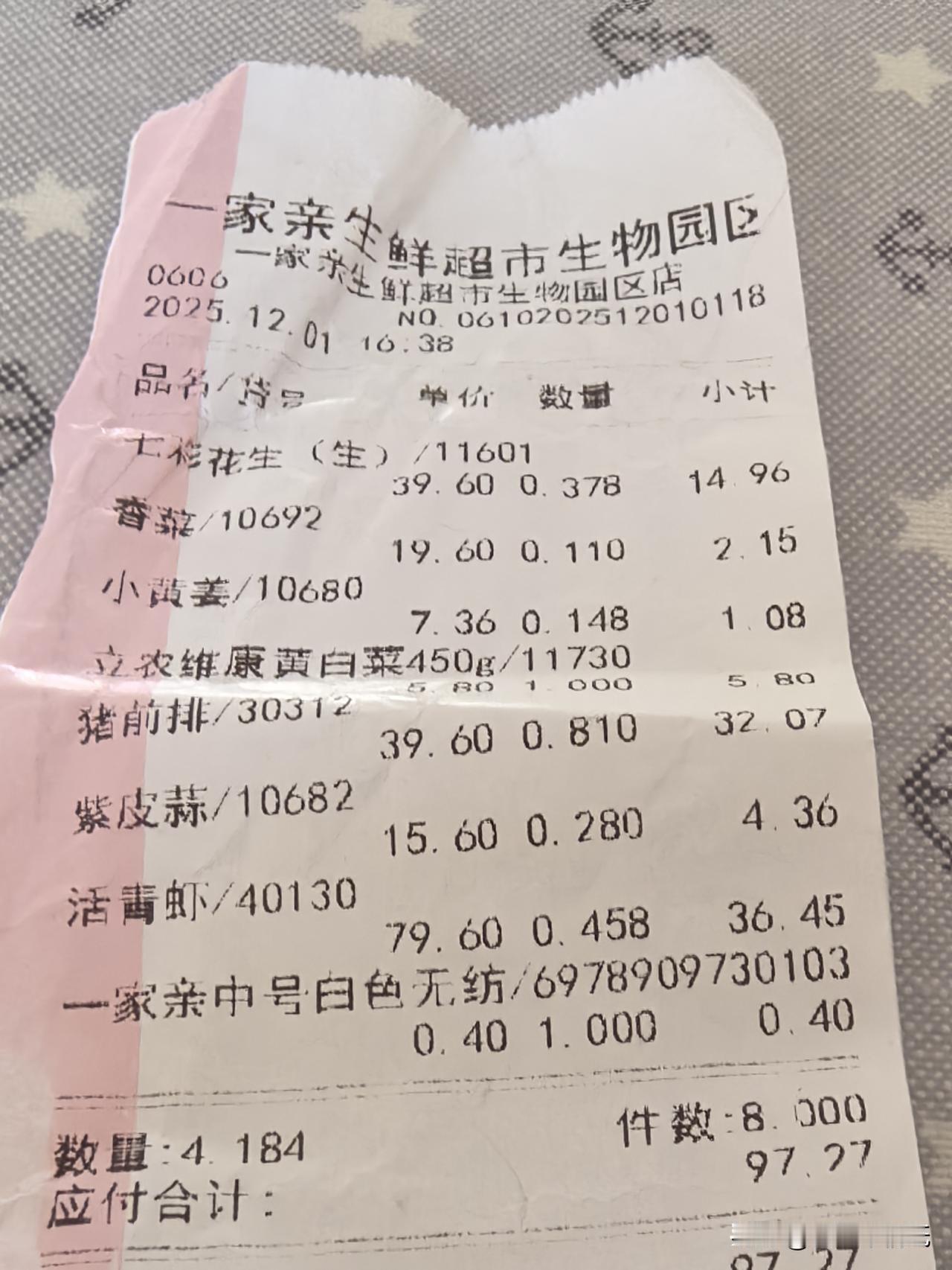 昨天去西宁一家亲生物园区店采购,买了蔬菜、鱼和猪肉等,总共花了将近100元。 其中活青虾每斤39.8元,买了不到一斤,花费36.45元;猪前排每斤19.8元,买了一斤左右,共计32.07元。 此外,紫皮大蒜每斤7.8元,七彩生花生每斤19.8元,香菜每斤也要9.8元。 想问问大家:这样的价格在西宁来说算贵吗?懂行情的朋友都来聊聊吧! 冬日生活打卡季 小青虾价格