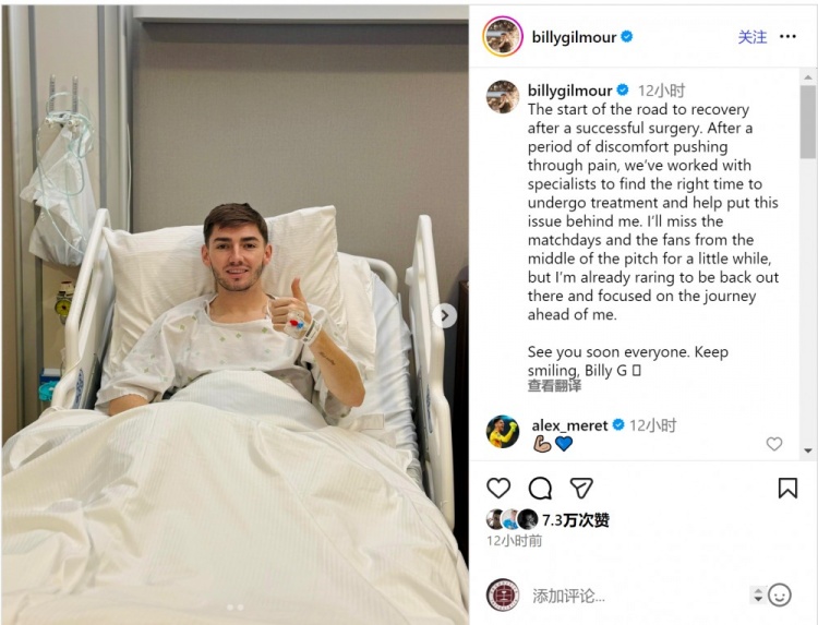 “接下来的一段日子,我会想念比赛日和球迷们,但我已迫不及待重返赛场,并将全力专注于眼前的康复征程。大家很快再见。保持微笑,比利(吉尔莫)!”