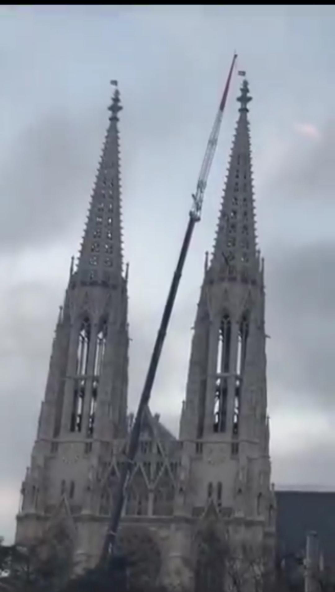 奥地利维也纳誓愿堂塔顶被挂上巴勒斯坦国旗,此举被奥地利部分人视为对基督徒的攻击及伊斯兰征服的挑衅姿态。图片显示起重机正移除旗帜。