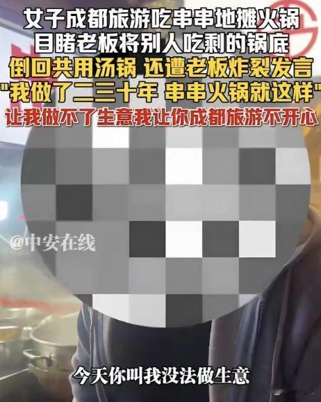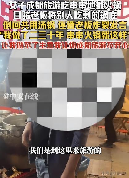 太坏了!女子去成都旅游,晚上找了一家地摊火锅吃串串,结果这期间女子就亲眼目睹,老板将别人吃剩的锅底,两次倒回共用汤锅内。[嘘] 但让女子没想到是,当其上前质疑老板的行为时,老板不但炸裂发言狡辩,女子拨打了市场监督局后还威胁女子,称:如果闹得我做不成生意,那也要让女子在这里耍得不开心! 在成都春熙路夜市,一家名叫“猫哥串串”的摊点,因为一种做法引起了关注,一名外地游客在就餐时看到,摊主将旁边一桌客人吃完的串串锅底,直接倒回了公用的汤锅里。 这位游客叫宁小妮,她当时看到摊主这样操作了两次,发现问题后,她立刻向摊主提出了疑问, 对此,摊主回答说,这是行业里常见的做法,并说自己干这行已经很多年了,这个解释并没有打消宁小妮的疑虑,她随后拨打电话向市场监管部门反映了情况。 从食品安全的角度看,将顾客食用过的废弃汤底回收再使用,存在不小的健康风险,餐饮行业的操作规范也明确要求,餐厨废弃物应该单独处理,不能回收加工再次用于制作食品。 目前成都的市场监管部门已经介入此事并展开调查,在夜市这样的餐饮形态里,确保食材和汤底的“一客一用”是最基本的卫生底线。 成都夜市“回收锅底”事件的处理结果公布后,迅速在网络上引发热议,网友们从不同角度发表了看法,讨论焦点集中在食品安全、游客维权和夜市管理等方面。 “看到处理结果,感觉挺解气的。” “监管部门反应迅速,罚得也到位,这对不良商家是个警示。” “不能让个别摊位坏了成都美食的名声。” “为这位游客点赞,遇到问题敢于站出来,不仅维护了自己,也帮了大家。” “以后吃串串得多个心眼了,”有网友分享经验,“要看是不是每桌单独用油,能不能看到后厨操作。” “要定期抽查,建立黑名单制度,让违规者无处遁形。” “夜市是城市烟火气的重要部分,不能因噎废食。” “关键是要规范管理,让游客吃得放心、玩得开心。” “作为成都人,看到这个消息很生气。” “我们欢迎全国游客来品尝美食,但绝不容许有人破坏成都餐饮的形象。” 您在外出就餐时,是否也曾遇到过类似的食品安全问题?对于规范夜市摊贩的经营,您有什么好的建议?欢迎在评论区分享您的经历和看法。 信息来源:中安在线