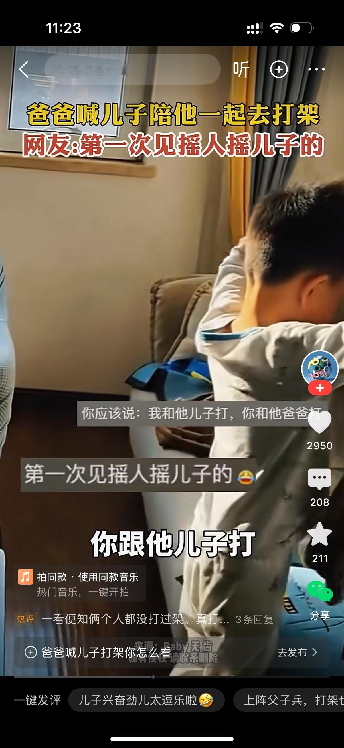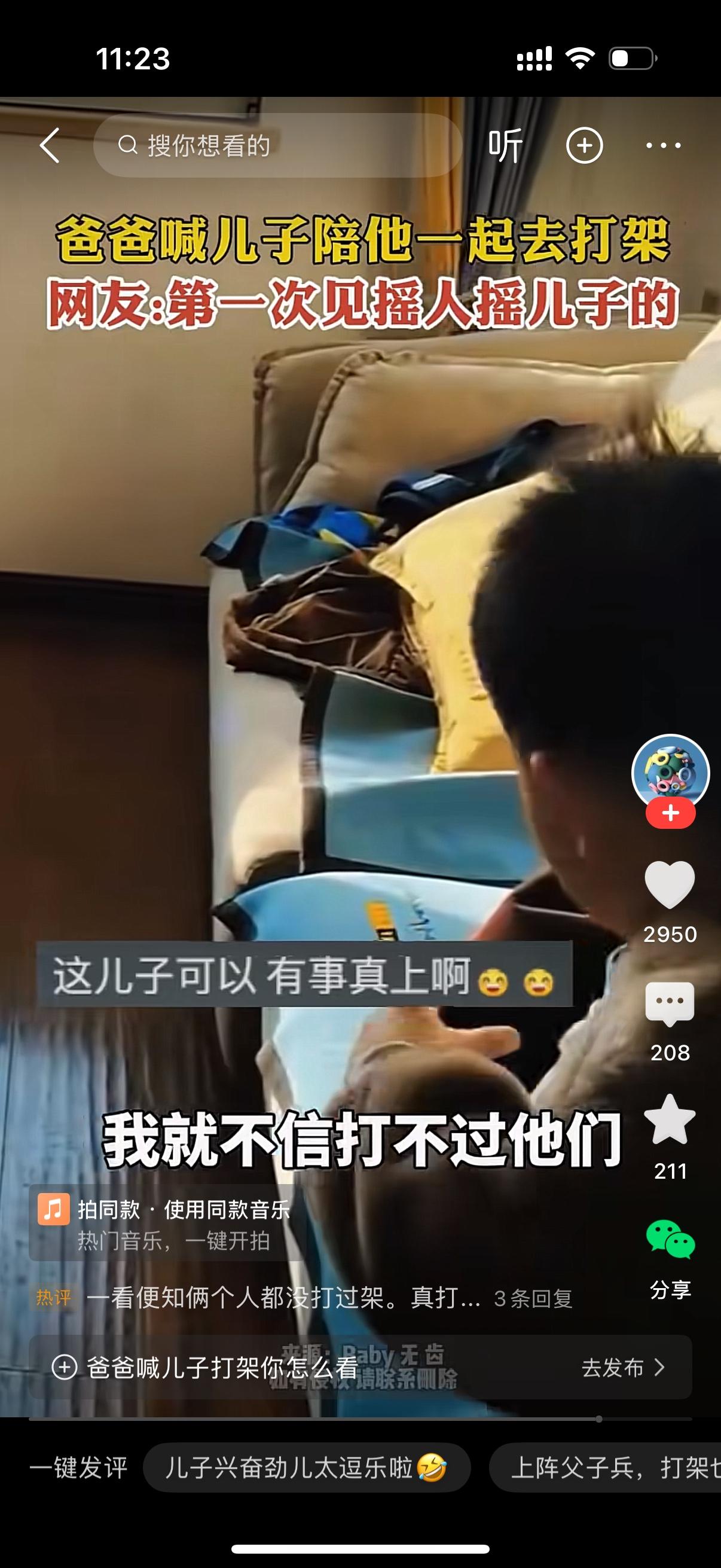 爸爸跟人打完架回到家,叫儿子赶紧穿衣服。儿子问你要干啥?爸爸说打架,刚才一个男的和他小孩一块打我了。到时我跟他爸爸打,你跟他儿子打。他儿子有点胖。儿子边穿衣服边说,我就不信打不过他们。爸爸说,你可以的,一定可以的。父子俩就这样整装待发打架去了。