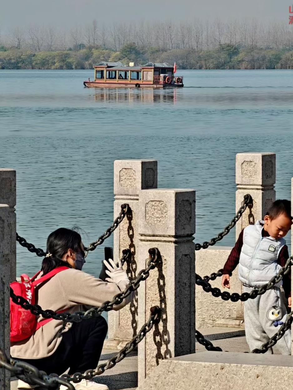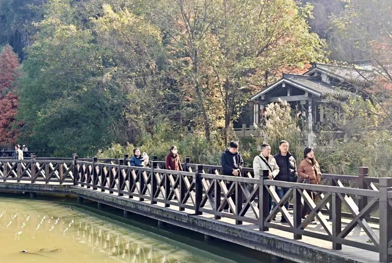 木桥浸在秋波里,栏杆的影揉碎了水色。身后林叶半青半红,古亭藏在苇丛边,游人的脚步轻踩着这一程的闲暖。