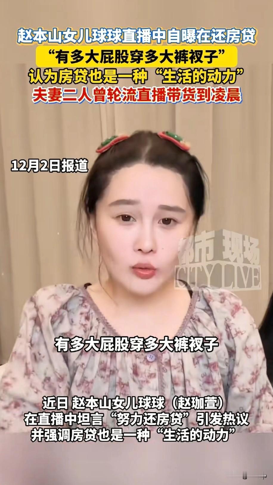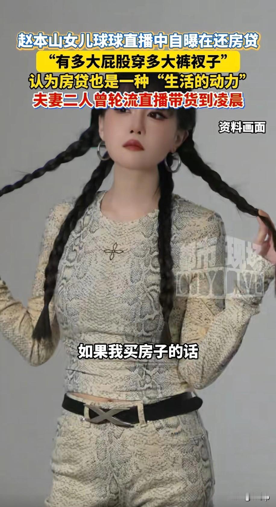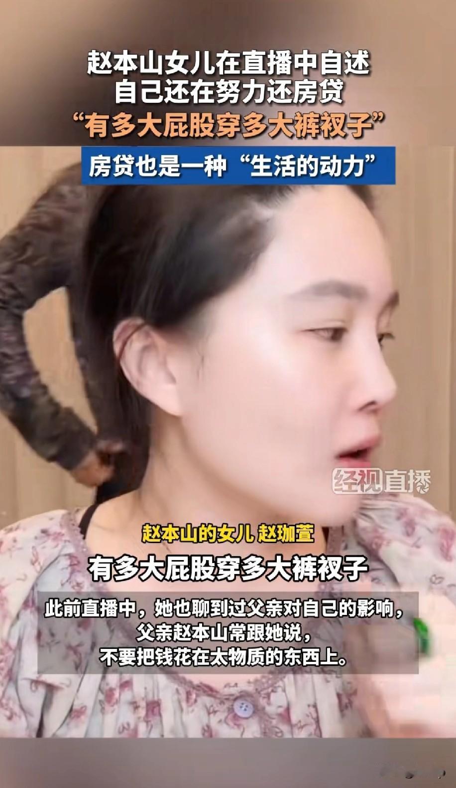 你敢相信吗赵本山的女儿还在还房贷 她说很多人不相信 还说怎么不朝你爸要 她回应说:“有多大屁股穿多大裤衩子,我也是过平常的生活,你看我现在穿的这衣服一百来块钱,就觉得挺好” 现在每天卖货能够自给自足 她老公的公司现在有六七百人,每天人吃马嚼的都是钱呐。 看来球球挺务实,有非常正的消费理念也有非常正的三观,前提条件都是家底厚的原因,有上一辈给打好的基础 毕竟大树底下好乘凉😎