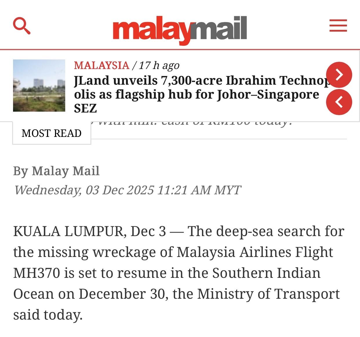 马媒:马来西亚将于本月底重启MH370失事客机搜寻工作 马来西亚《马来邮报》官网吉隆坡12月3日报道:马来西亚交通部今天表示,将于12月30日在南印度洋,恢复对马来西亚航空公司MH370航班失踪残骸的深海搜寻工作。 报道说,交通部在一份声明中表示,美国”海洋无限”(Ocean Infinity)公司已确认将重新开始为期55天的海底搜索行动,但搜寻会以间歇性形式展开。 根据马来西亚政府与Ocean Infinity于2025年3月25日签署的服务协议,搜索将集中在被评估为最有可能找到飞机的区域。 交通部在声明中表示:“最新的事态发展,凸显了马来西亚政府致力于为受这场悲剧影响的家庭提供安慰服务”(“The latest development underscores the Government of Malaysia’s commitment to providing closure to the families affected by this tragedy,” the ministry said)。 报道说,载有227名乘客和12名机组人员的MH370航班于2014年3月8日从吉隆坡国际机场(KLIA)出发前往北京后失踪。尽管航空史上最大的搜索工作覆盖了印度洋南部46,000多平方英里,但只发现了飞机的几块碎片,而且散落在相隔数千英里的海滩上。 报道的原标题是《Hunt resumes: MH370 search back in Southern Indian Ocean from Dec 30, says Transport Ministry》(恢复搜索:交通部表示,MH370搜索将于12月30日在南印度洋重启)。
