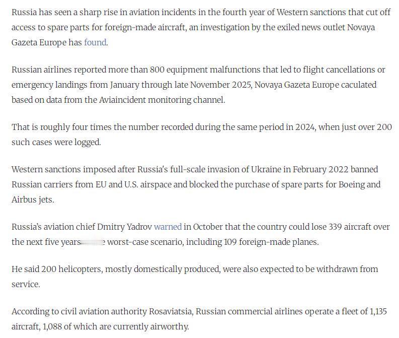 【因遭制裁 2025年俄罗斯客机事故数量激增四倍】西方对俄罗斯实施制裁的第四年,俄罗斯航空事故急剧增加。从2025年1月到11月底,俄罗斯航空公司报告了800多起设备故障,导致航班取消或紧急迫降。这大约是2024年同期记录的数量的四倍,当时记录的此类病例只有200多起。俄罗斯于2022年2月全面入侵乌克兰后,西方对俄罗斯实施制裁,禁止俄罗斯航空公司进入欧盟和美国领空,并禁止购买波音和空客飞机的零部件。俄罗斯航空局长德米特里·亚德罗夫去年10月警告称,在最坏的情况下,俄罗斯可能在未来5年损失339架飞机,其中包括109架外国制造的飞机。他说,预计还将有200架直升机退役,其中大部分是国产直升机。全网热点共创计划 烽火问鼎计划