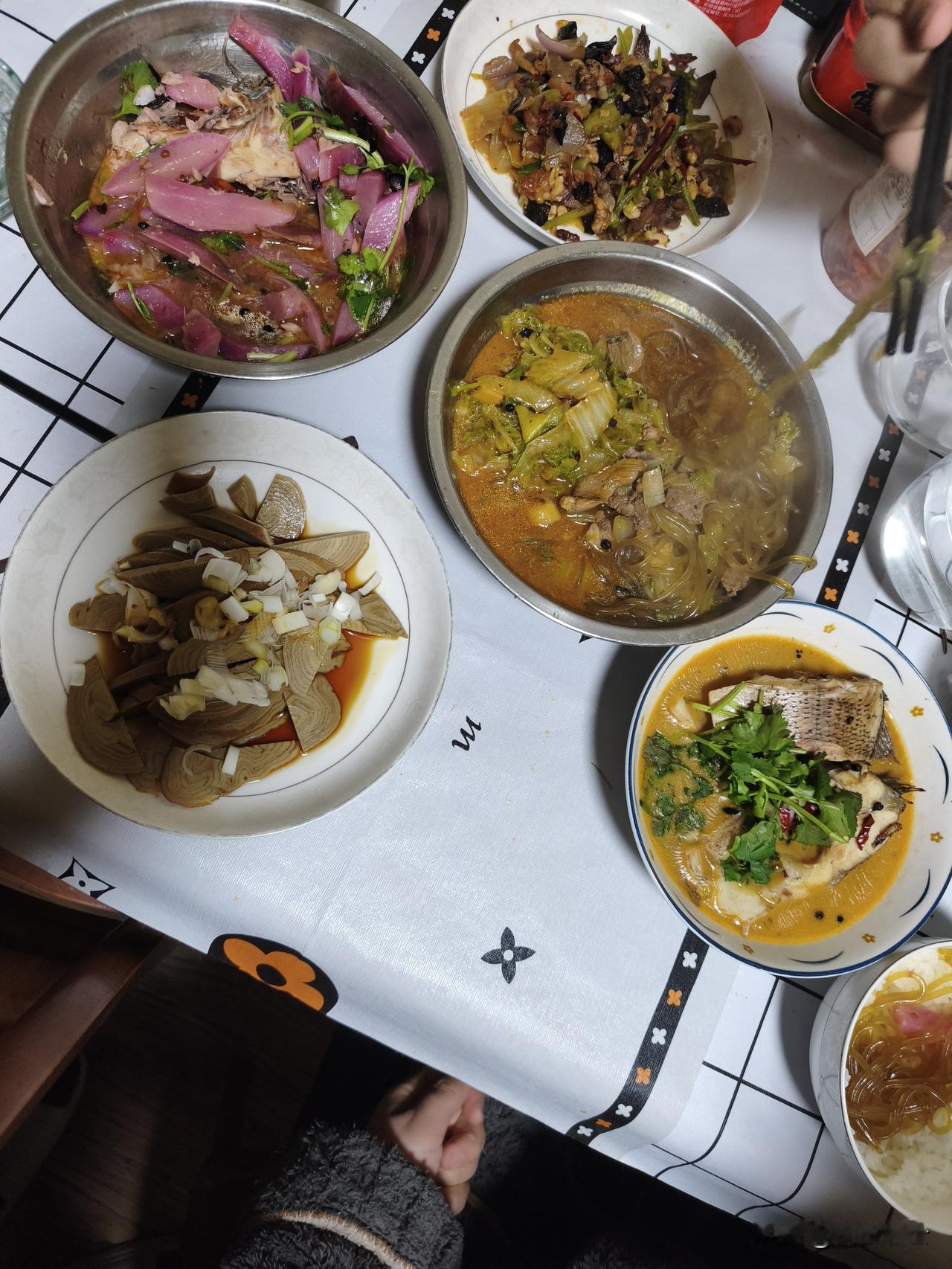 今天中午继续菜煎饼➕两个鸡蛋[笑哭]昨晚我爸给做的烧鲈鱼,羊肉白菜,调素鸡,芹菜炒肉丝。天天我也不知道吃啥好,曾经二十多岁的时候,有一次吃了很久的番茄鸡蛋盖浇饭还有鸡蛋炒饭,我对吃喝合口就好,没有过多的要求! 看看当下的大盘,还是那个格局,往上没有多大上攻的动能,往下又没有多大深跌的基础。这样的洗盘行情就慢慢耗吧[笑哭]反正我们有的是时间,急啥!