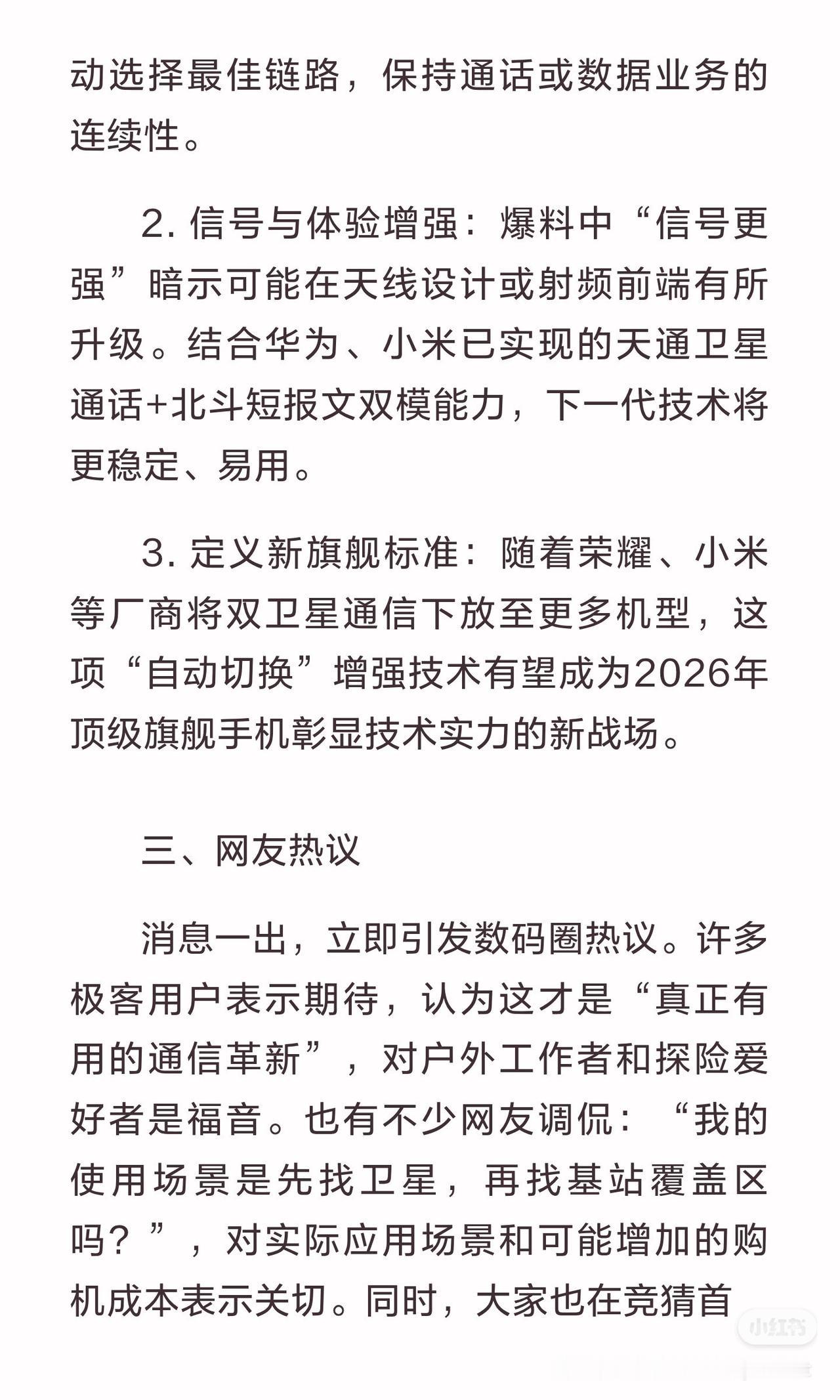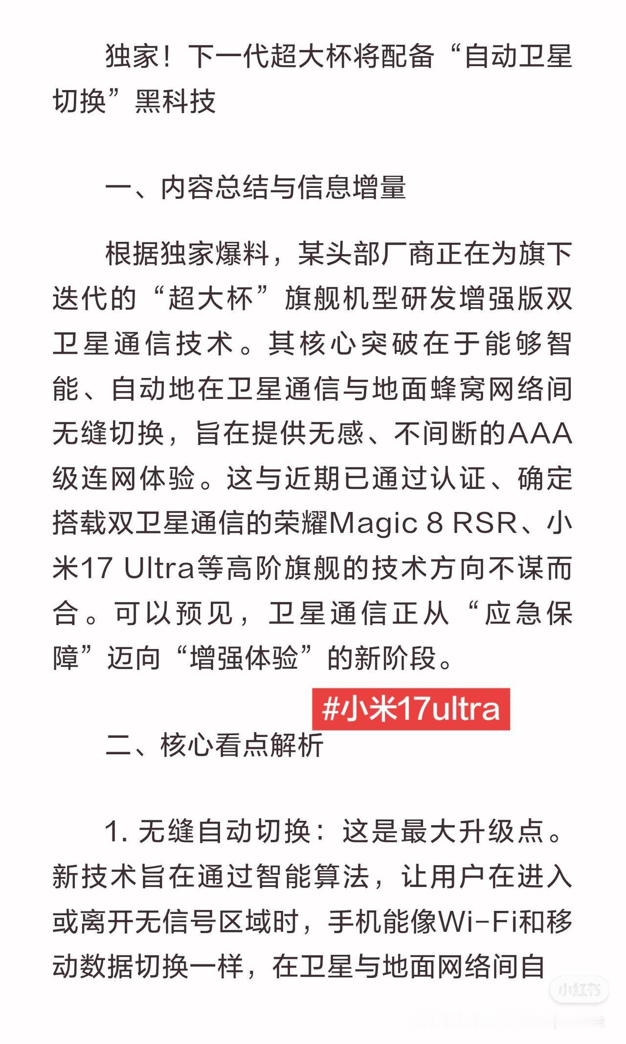 独家!下一代超大杯将配备“自动卫星切换”独家!下一代超大杯将配备“自动卫星切换”黑科技 一、内容总结与信息增量 根据独家爆料,某头部厂商正在为旗下迭代的“超大杯”旗舰机型研发增强版双卫星通信技术。其核心突破在于能够智能、自动地在卫星通信与地面蜂窝网络间无缝切换,旨在提供无感、不间断的AAA级连网体验。这与近期已通过认证、确定搭载双卫星通信的荣耀Magic 8 RSR、小米17 Ultra等高阶旗舰的技术方向不谋而合。可以预见,卫星通信正从“应急保障”迈向“增强体验”的新阶段。 二、核心看点解析 1. 无缝自动切换:这是最大升级点。新技术旨在通过智能算法,让用户在进入或离开无信号区域时,手机能像Wi-Fi和移动数据切换一样,在卫星与地面网络间自动选择最佳链路,保持通话或数据业务的连续性。 2. 信号与体验增强:爆料中“信号更强”暗示可能在天线设计或射频前端有所升级。结合华为、小米已实现的天通卫星通话+北斗短报文双模能力,下一代技术将更稳定、易用。 3. 定义新旗舰标准:随着荣耀、小米等厂商将双卫星通信下放至更多机型,这项“自动切换”增强技术有望成为2026年顶级旗舰手机彰显技术实力的新战场。 三、网友热议 消息一出,立即引发数码圈热议。许多极客用户表示期待,认为这才是“真正有用的通信革新”,对户外工作者和探险爱好者是福音。也有不少网友调侃:“我的使用场景是先找卫星,再找基站覆盖区吗?”,对实际应用场景和可能增加的购机成本表示关切。同时,大家也在竞猜首发厂商,普遍认为在卫星通信领域积累深厚的品牌可能性最大。