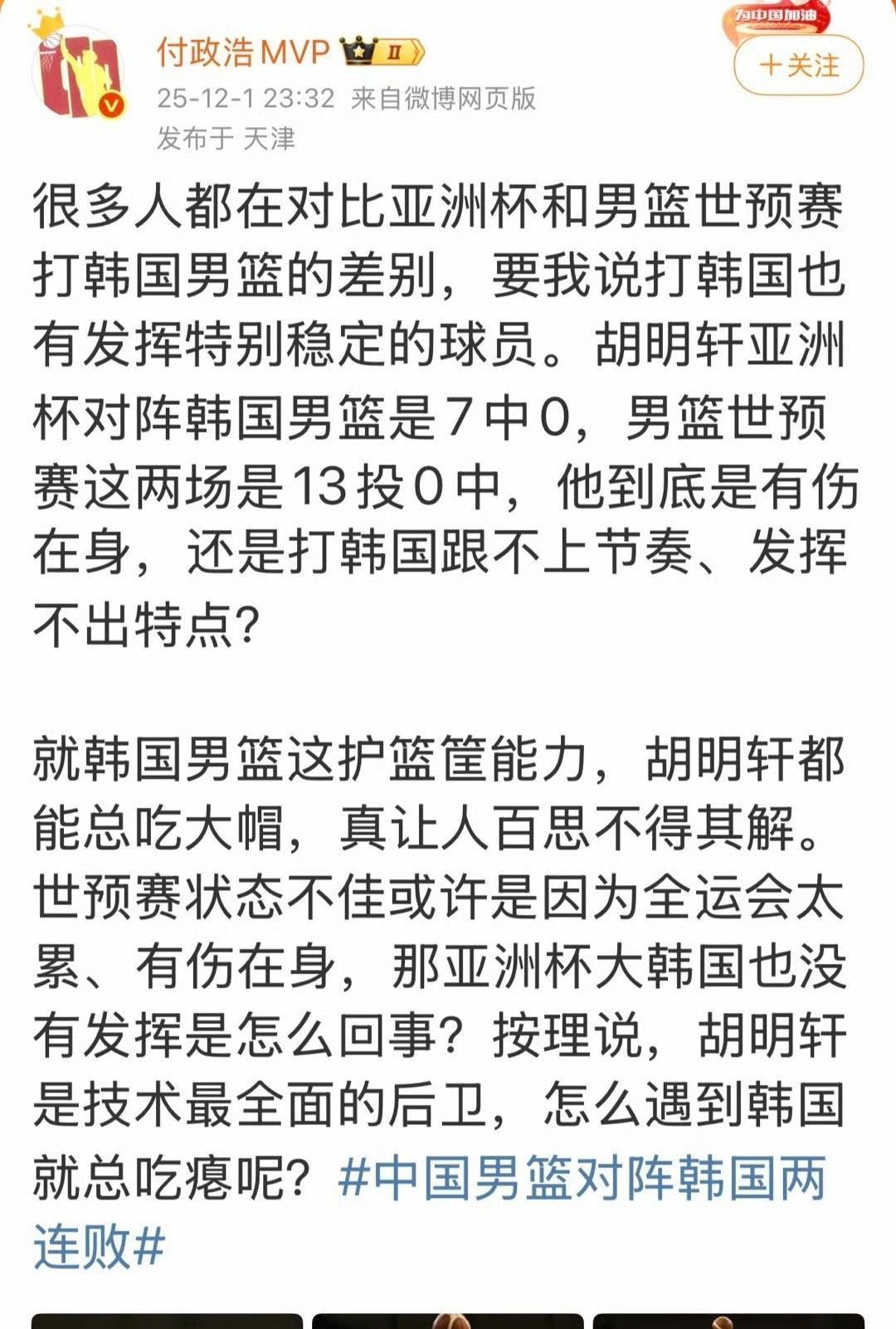 搞笑一幕,篮球记者和球迷讨论胡明轩的状态,顺水推舟,不失风趣 球迷:你对胡明轩有偏见。 恕我直言,球员的状态起伏跌宕也正常,毕竟在全运会结束后,不到一个礼拜就开始接受世预赛洗礼,据cba篮球记者邵化谦、季孟年、殳海等人分析,中国队连败有轻敌、准备不足、教练点将诸多问题,男篮表现失常,胡明轩在全运会就打得不好,郭士强依然选择他