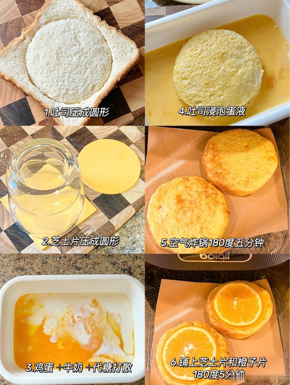 2025就快翻篇儿了🔚就做点美好的事让来年心想事成吧🍊橙子是冬天最爱的水果了酸酸甜甜的,和吐司一起烤,满屋子都是橙子的香气🍃准备:吐司两片鸡蛋1个牛奶香橙两片代糖少许🍃做法:1️⃣用杯子将吐司和芝士片压成圆形2️⃣鸡蛋打散加入少许牛奶,一点代糖搅匀,将吐司蘸满蛋液3️⃣蘸满蛋液的吐司表面放一片芝士和一片橙子,空气炸锅180度10分钟压成圆形的橙香吐司🍞就像小蛋糕一样,仪式感满满 当下午茶也很不错哦,简单快手。姐妹们快做起来吧组个冬日养生局温暖的食光兴趣稀引力计划