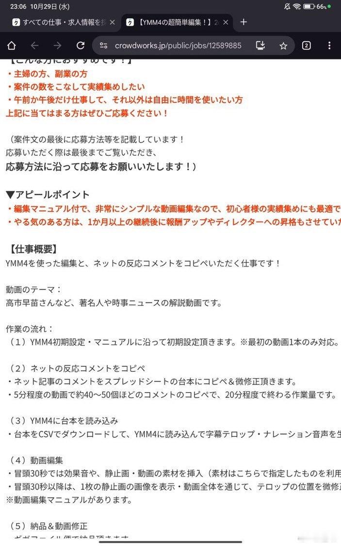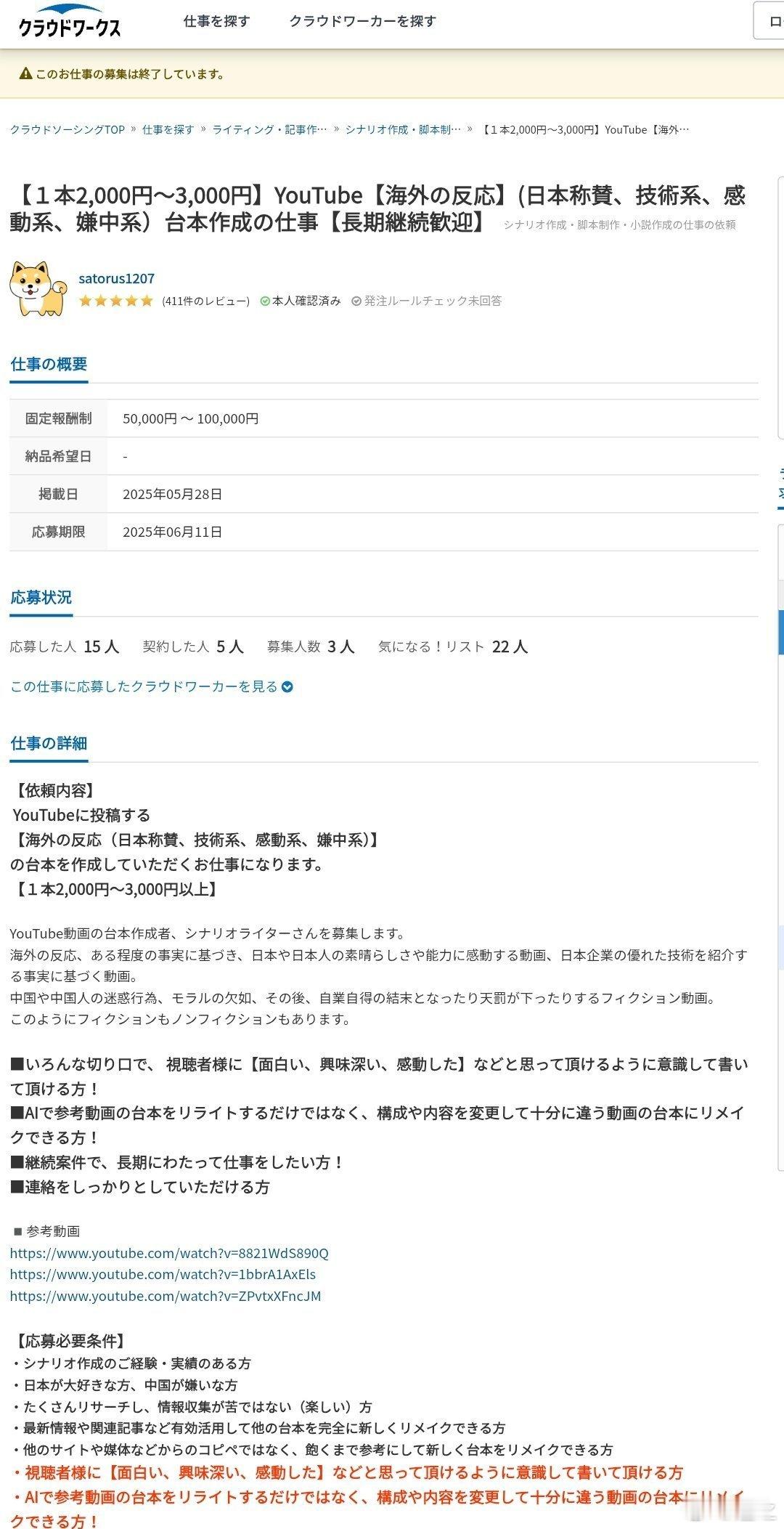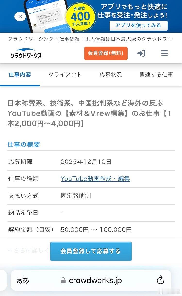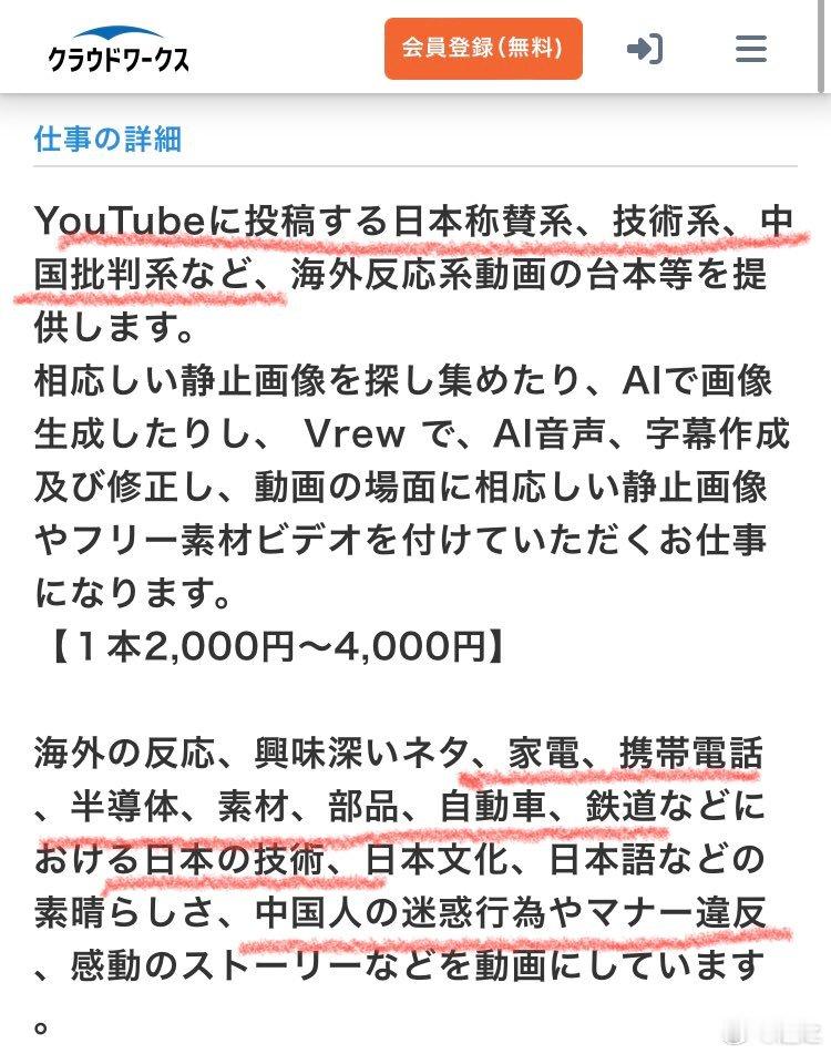 高市早苗老家奈良凉了这个内容很有趣,是一些日本网络自媒体报出来的。大量的在网上招人,制作支持高市早苗的视频,尤其是招在家的主妇(日本人一般结婚了就不上班了)。以前的要求是制作日本棒棒的,中国很糟糕的厌中系视频,最近是大力支持高市早苗的视频,上传油管。制作一个片子给2000-4000日元。实际上这种情况三四年前就已经开始了。所以日本年轻人被宣传洗脑也就不奇怪了 。第二个截屏的招人条件那里写的是:有经验、讨厌中国。
