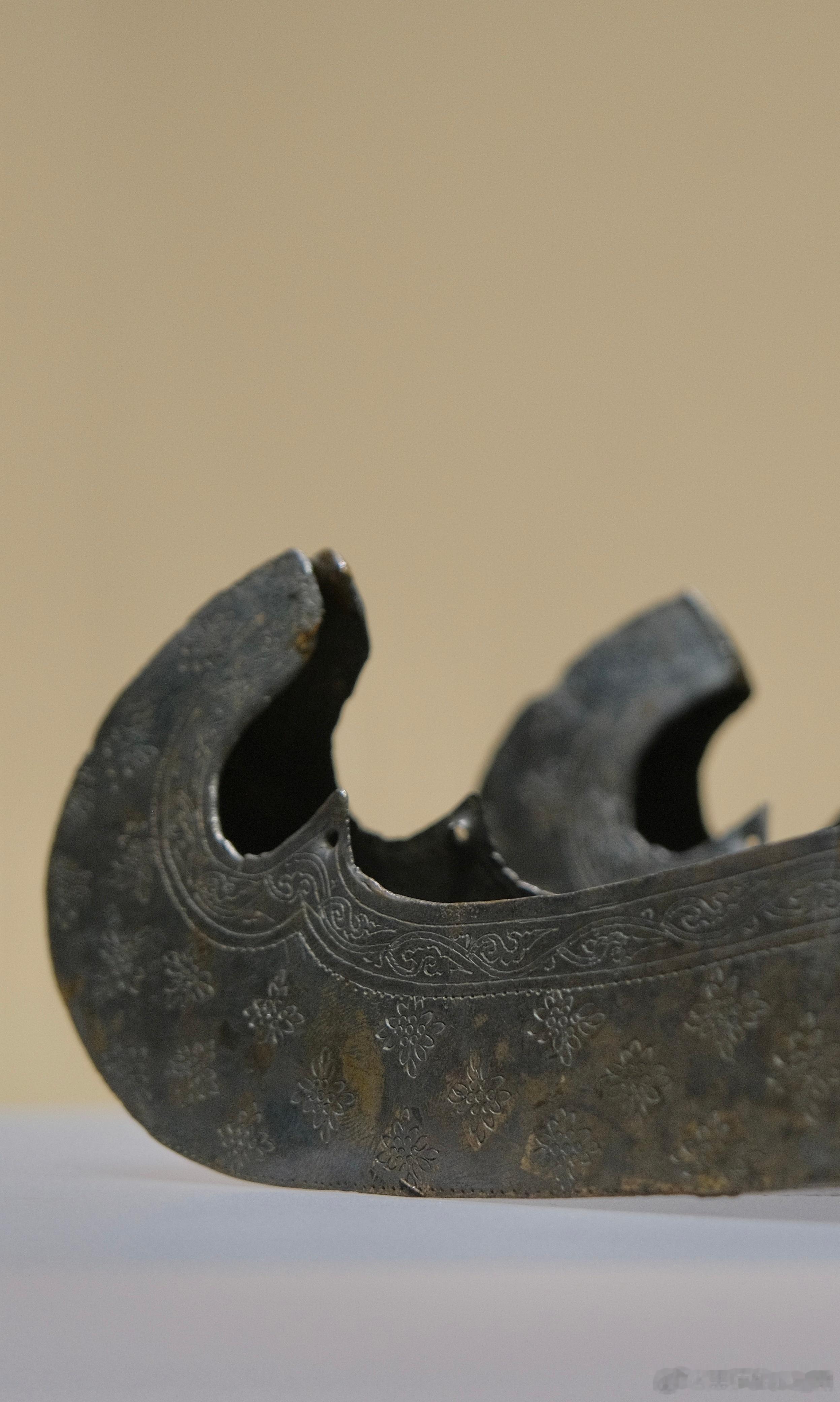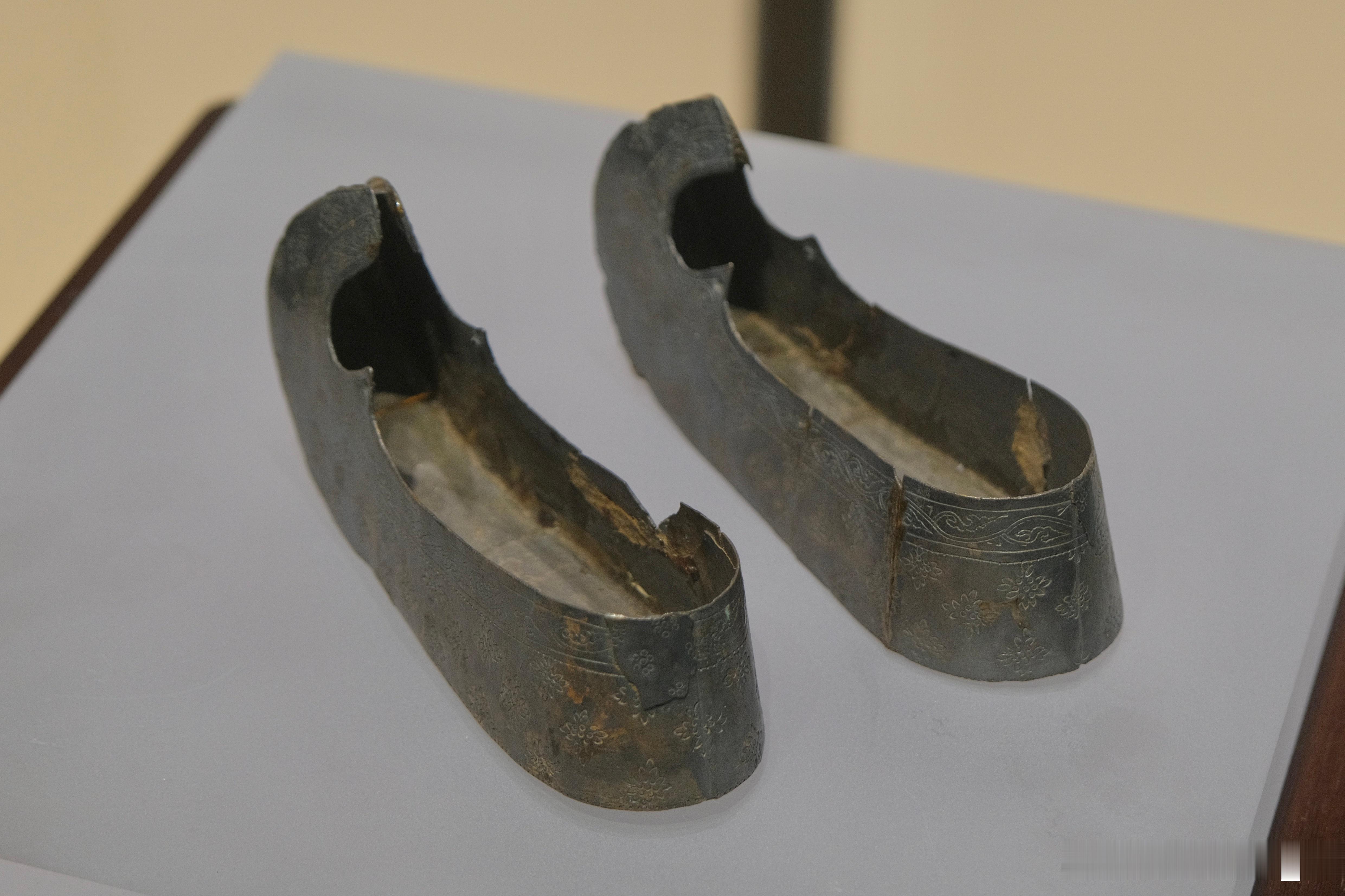 🏛️衢州博物馆罗双双银鞋/南宋史绳祖墓出土银质鞋一双,仿锦面布鞋的形式制作。每只鞋由鞋底一片、鞋面二片焊接而成。鞋头上翘,两侧前段内向出尖处有小穿孔,供系鞋带用。鞋面沿边錾卷草纹一周,遍身錾刻斜行排列整齐的小团窠花。鞋底錾刻线纹有如布鞋纳底的缝线,正中錾刻双钩“罗双双”三字。罗双双,即史繩祖墓志中所谓“元妃罗氏”,是墓主的原配妻子。用银制鞋陪葬,在南宋时十分少见。图五来自网络约会博物馆约会博物馆