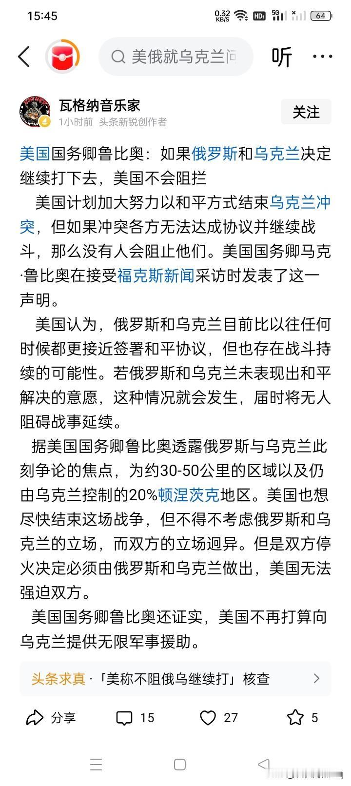 这态度有意思! 美国国务卿卢比奥在接受福克斯新闻记者采访时表示:如俄罗斯和乌克兰一定要继续打下去,那么没有任何人可以阻止他们,当然包括美国。同时卢比奥还称,美国不打算继续无限制向乌克兰提供武器装备等等的援助。 他的意思好像就是反正不是美国在打仗,如果你们不听美国的话,想怎么样打,就怎么样打。但这样无休无止下去的战争,乌克兰就不要想美国会再向他们提供军事援助了。也似乎就是说,乌克兰既然不愿意听美国的话,美国也不愿意再当老大了,自愿放弃全世界老大的位置。但是有一点,乌克兰要考虑明白,美国从此好像也不再援助乌克兰进行战争了。卢比奥的话似乎也合乎情理,因为援助是情分,尊重乌克兰的主权才是本分。 但是,美国支持和援助乌克兰,实际上对美国是有着不容忽视的巨大战略意义和经济利益的。乌克兰虽然与美国签署有矿产资源之类的协议,但毕竟是战争期间,目前并没有多大的意义。但是,如果因为乌克兰,美国与欧洲以及其他西方国家产生隔阂,对美国的损失可能是目前说不清楚的相当巨大。无论是政治、军事,还是经济利益,都需要一个和谐、友好的关系,否则,离了谁的马尿还不行船了!