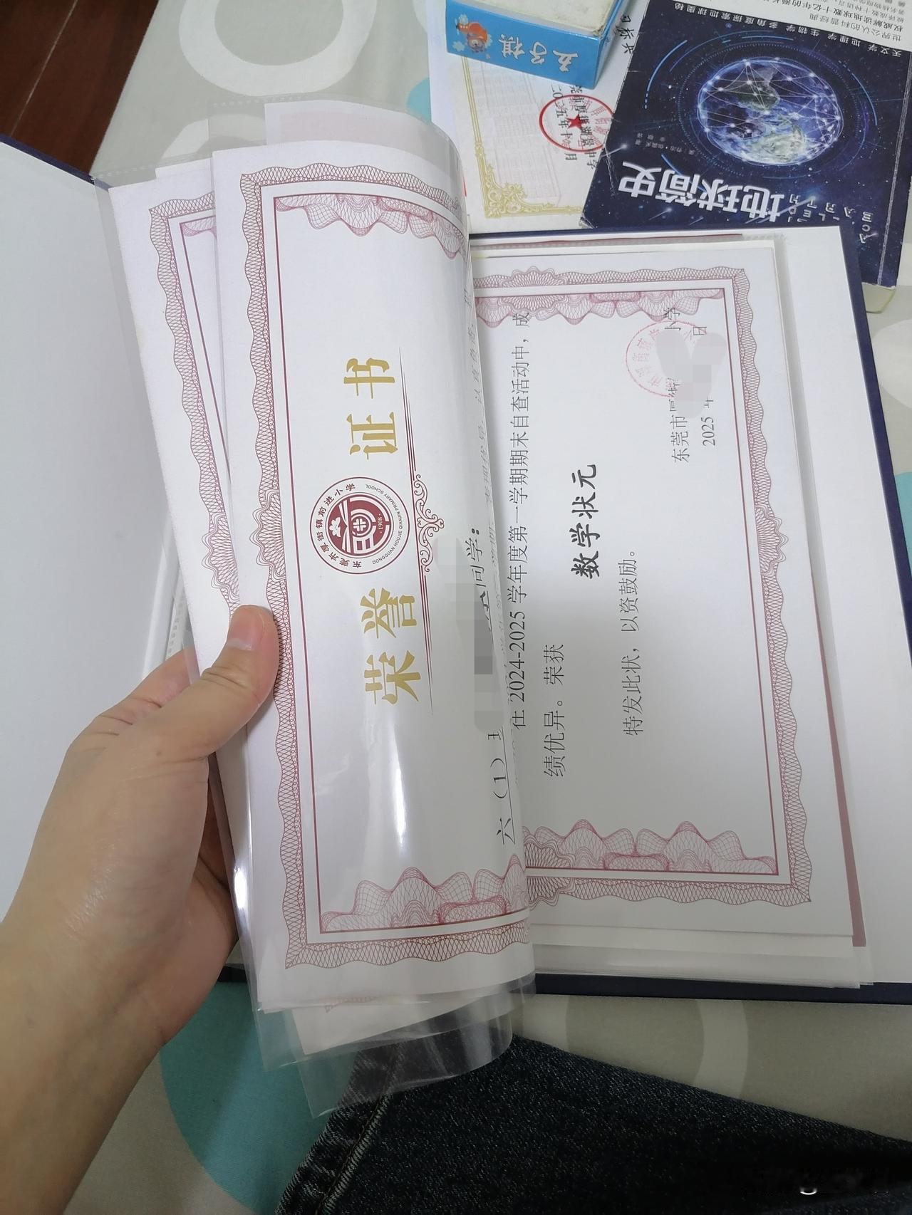 昨天整理儿子的房间,看到一个奖状本,整整满满一本奖状,记载了他的学习成果,从一年级到最近获得的奖状,翻开一看,得奖最多的居然是数学单科状元。我娃一直数学好,在小学阶段期中期末都是100分,现在到了初一还能得117分以上,这点随我,我上高中之前,一直数学成绩很好,到高中后数学开始拉垮了。 在陪娃学习的这六年中,让我产生一种错觉,我娃是超级学霸,除了语文得不到满分外,数学与英语都可以拿满分,还以为他是考清北的料呢? 这才上初一几个月,一次期中考试把我打回了现实,虽然年级60多名,可离考东莞中学的目标还是有些距离,不知期末考试会怎么样,能不能达到年级前30名,我觉得有些困难,毕竟学校学生1700多人。 上初中后他语文成绩不太理想,以前没重视阅读,平时不积累,初中跟小学语文考的完全不一样,现在是大语文时代,他这语文成绩会好才怪呢? 那些奖状代表过去,未来怎么样,还需努力。