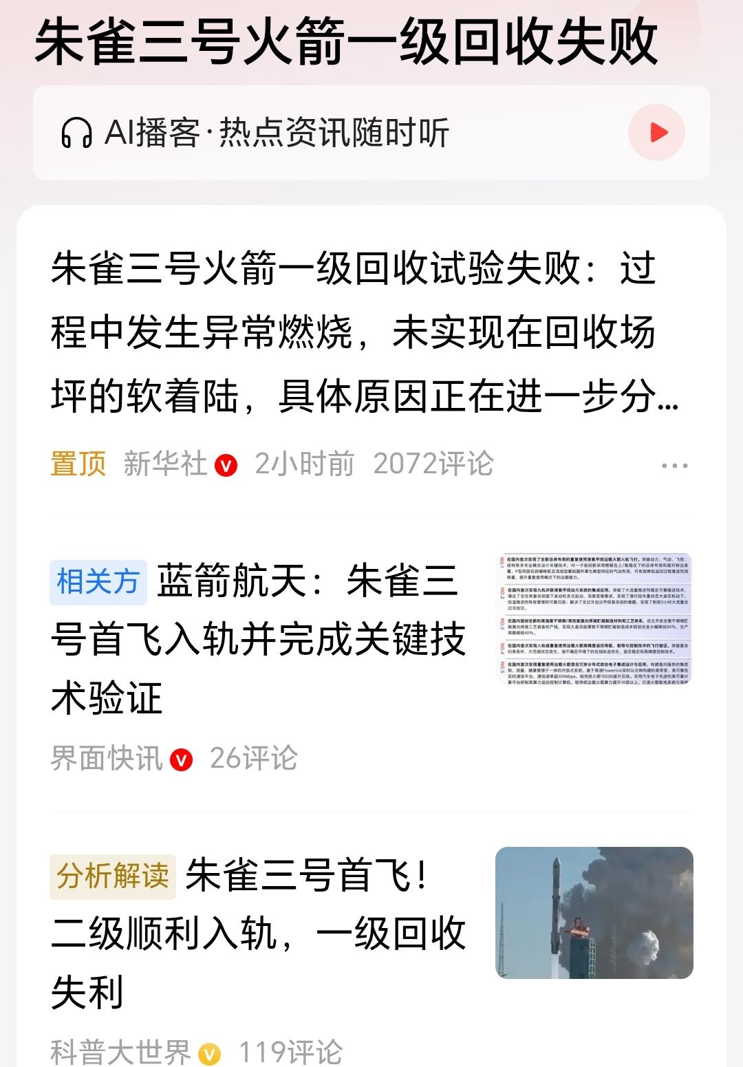 朱雀三号发射成功、回收失败。没关系,失败是成功之母。接下来还有长12甲和天空三号两款回收火箭等着试验。 不像以前我们必须精打细算,搓一发就得好几年。现在有大工业体系成熟产业链,完全可以大干快上。 只要是人做出来的,我们都能做出来。 这就是现在我们中国人的底气。 马斯克的神话很快就要破了。 点右上角关注我,我们一起去看这个魔幻的世界