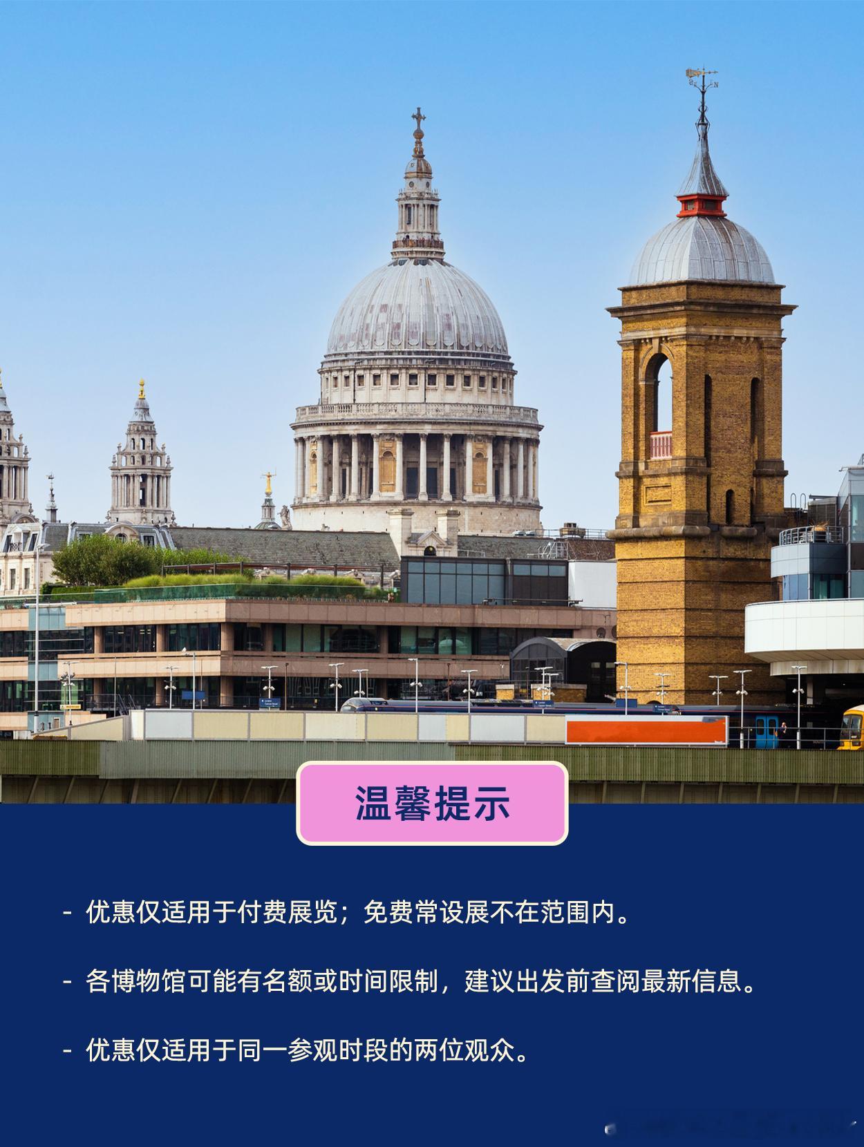 带您前往伦敦的列车,不仅是一段旅程的开始,更可以为您带来一段艺术之行。现在,凭一张有效的 Eurostar 车票,您可以在多家伦敦知名博物馆享受 “两人同行,一人免费” 的特别优惠。此福利覆盖以下六家文化地标:🏛️Tate Modern / Tate Britain — 从当代艺术到英国经典,河岸两端的灵感回响。皇宫🏛️Victoria and Albert Museum (V&A) — 时尚、设计与工艺的殿堂,收藏跨越数百年。🏛️Science Museum — 探索科技、创新与未来的互动空间。🏛️National Gallery — 梵高、特纳与莫奈的原作静候您的目光。🏛️Royal Academy of Arts — 当代艺术与建筑展览的核心舞台。🏛️Barbican Art Gallery — 伦敦最具个性的艺术综合体,展览与表演交织共生。如何使用 1️⃣ 持有效 Eurostar 去程或回程车票(纸质或电子皆可) 2️⃣ 在上述博物馆现场票务处出示车票 3️⃣ 按指引购买门票并享受 2-for-1 优惠部分展览可能需提前于官网登记或领取优惠凭证,详情请参见官🕸️。快来跟着Eurostar一起,开启您的艺术之旅。
