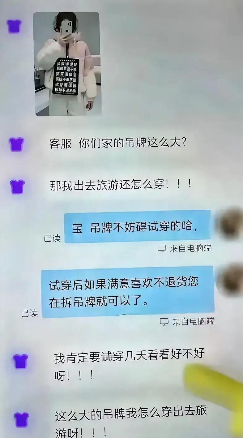 怎么会有这种人啊! 一女子网购了衣服后,发现吊牌巨大,然后就质问商家,为啥吊牌
