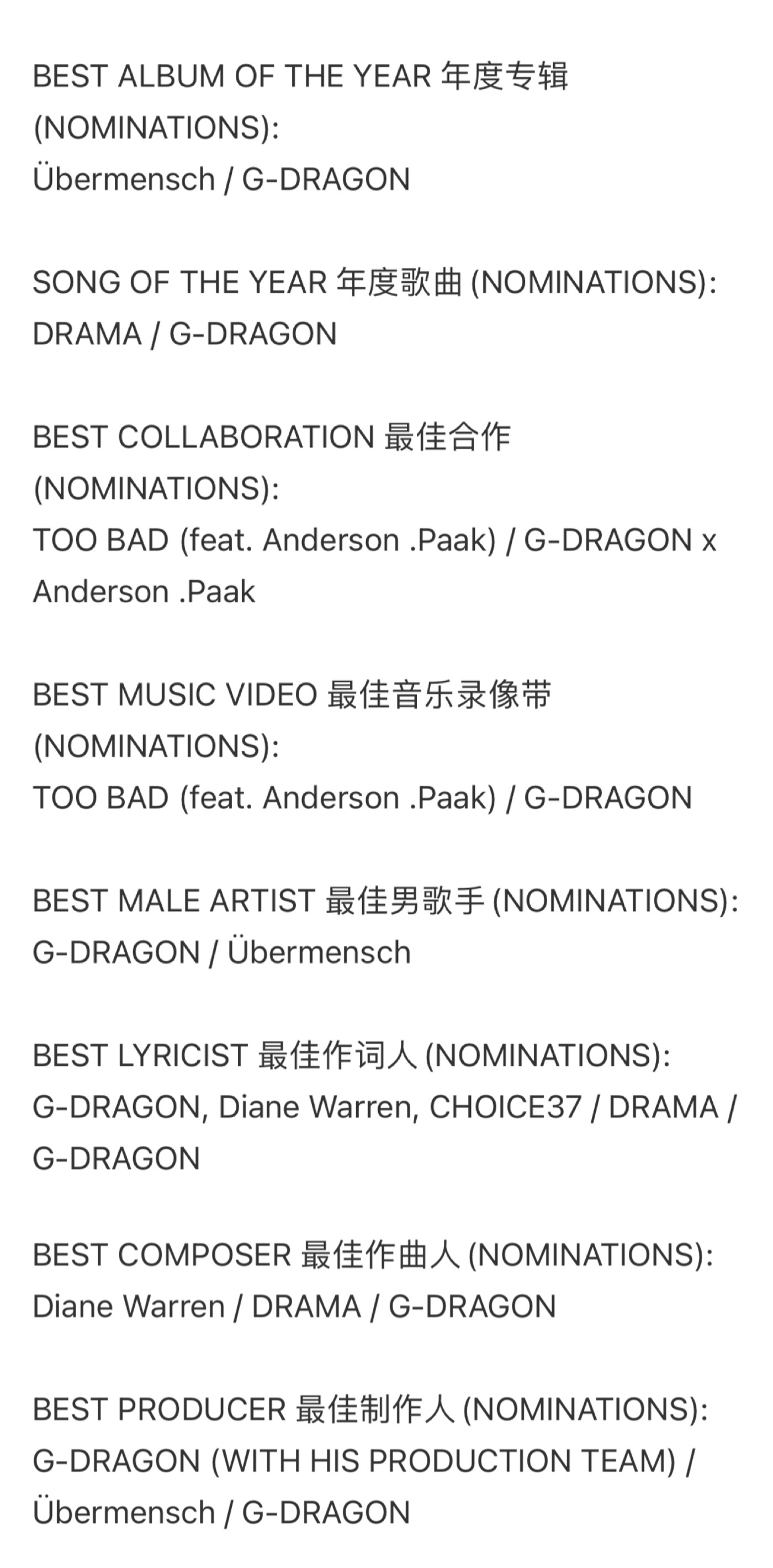 权志龙亚洲流行音乐大奖8项提名 权志龙又横扫了🏆亚洲流行音乐大奖(APMA)权