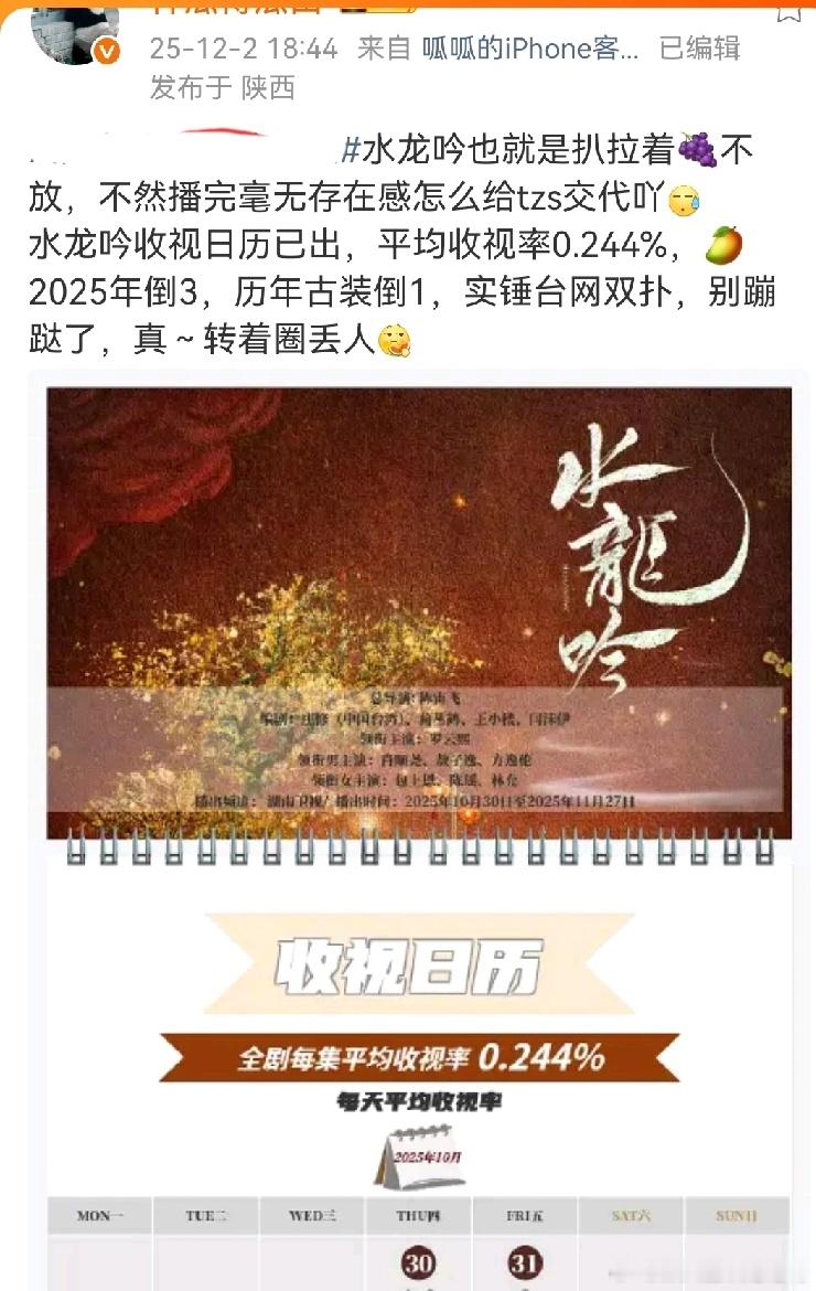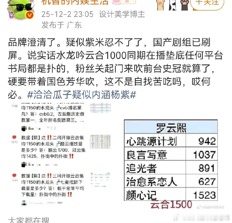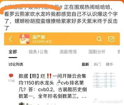 男的剧扑了粉丝到处缠着杨紫闹 想证明男的网播1000w+、收视率倒数第三的剧没扑 是🥭“史冠”。图4️⃣男的又不是第一次扑街,今年在别的平台的剧不也扑街了。 碰瓷杨紫也没用啊,杨紫又不能帮他演,虽然可以女扮男装,但是杨紫那么忙,应该没时间