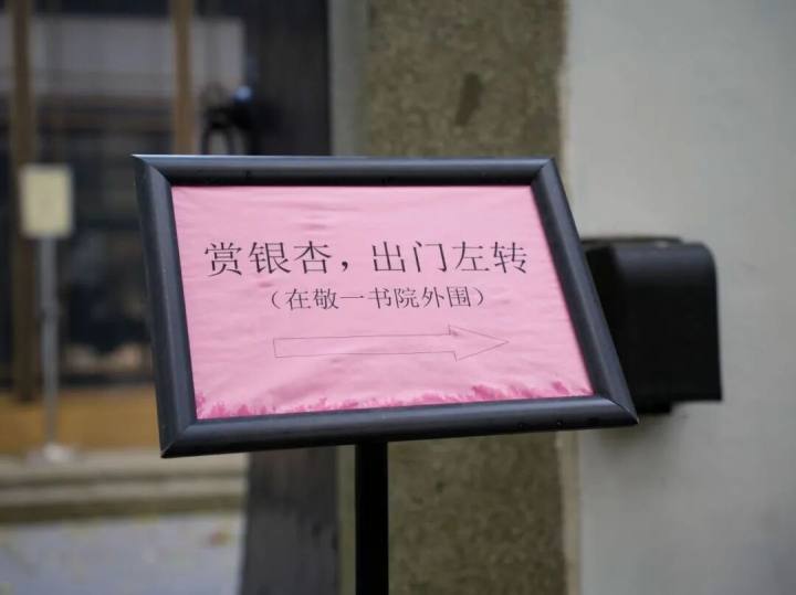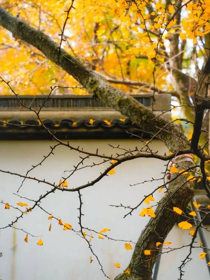 青砖灰瓦,透着清幽。门口立着一块告示牌:“赏银杏,出门左转”。我不禁莞尔,这倒是省去了询问的工夫。